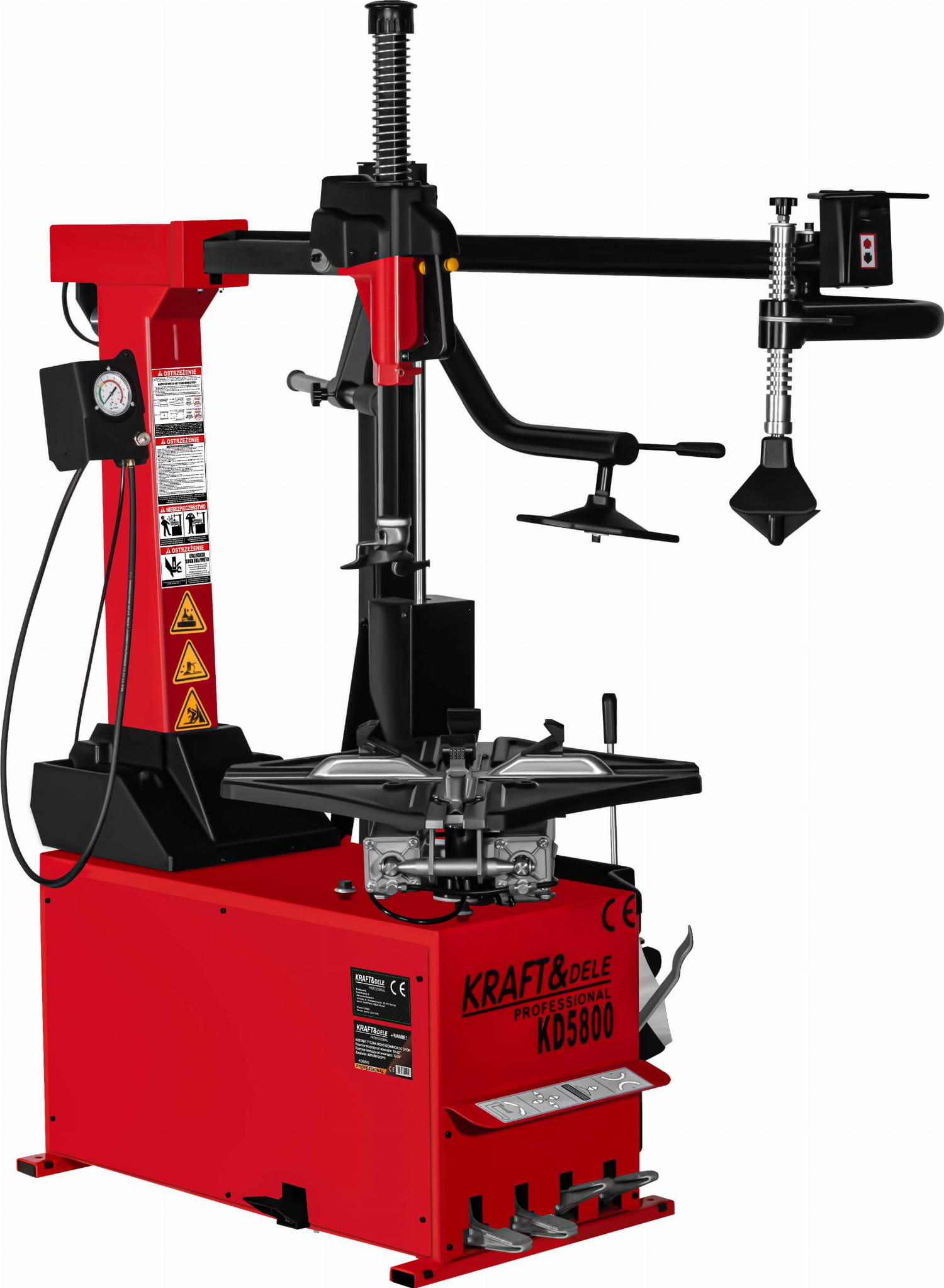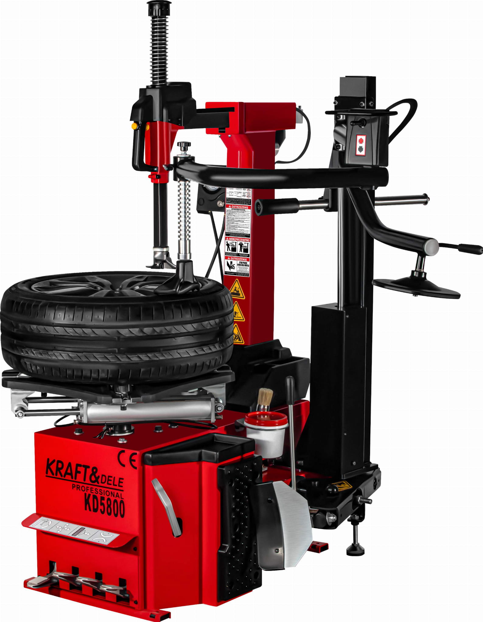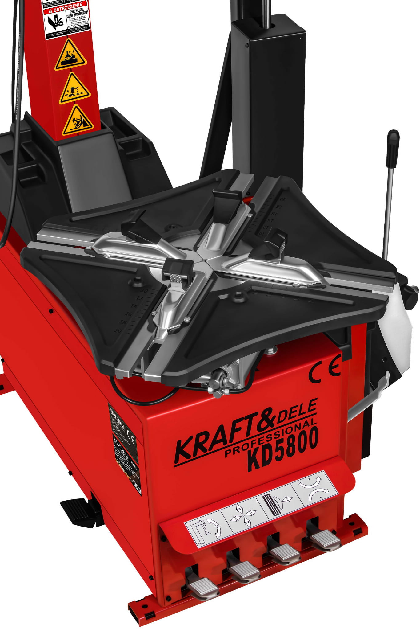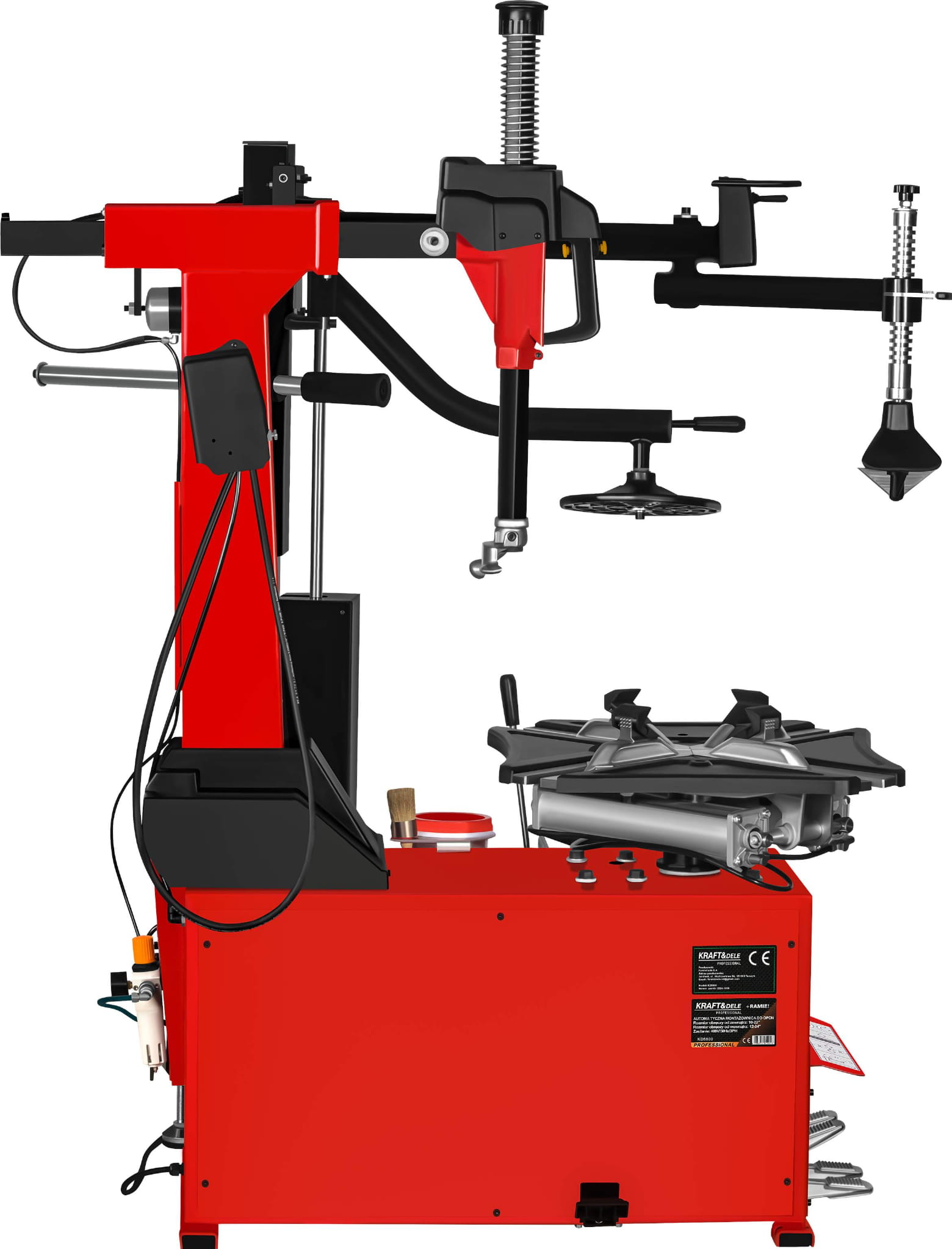 KD5800 to profesjonalna automatyczna montażownica do opon marki KRAFT&DELE, zaprojektowana z myślą o intensywnej eksploatacji w warsztatach samochodowych oraz serwisach wulkanizacyjnych. Urządzenie łączy solidną konstrukcję z nowoczesnymi rozwiązaniami, zapewniając wysoką wydajność pracy oraz komfort obsługi nawet przy wymagających kołach. Ergonomiczne pedały sterujące umożliwiają wygodną i precyzyjną obsługę montażownicy bez użycia rąk. Każdy pedał odpowiada za inną funkcję urządzenia, co pozwala na płynną i efektywną pracę podczas montażu i demontażu opon. Maszyna ma wbudowane zawieszenie na kubek ze smarem montażowym.