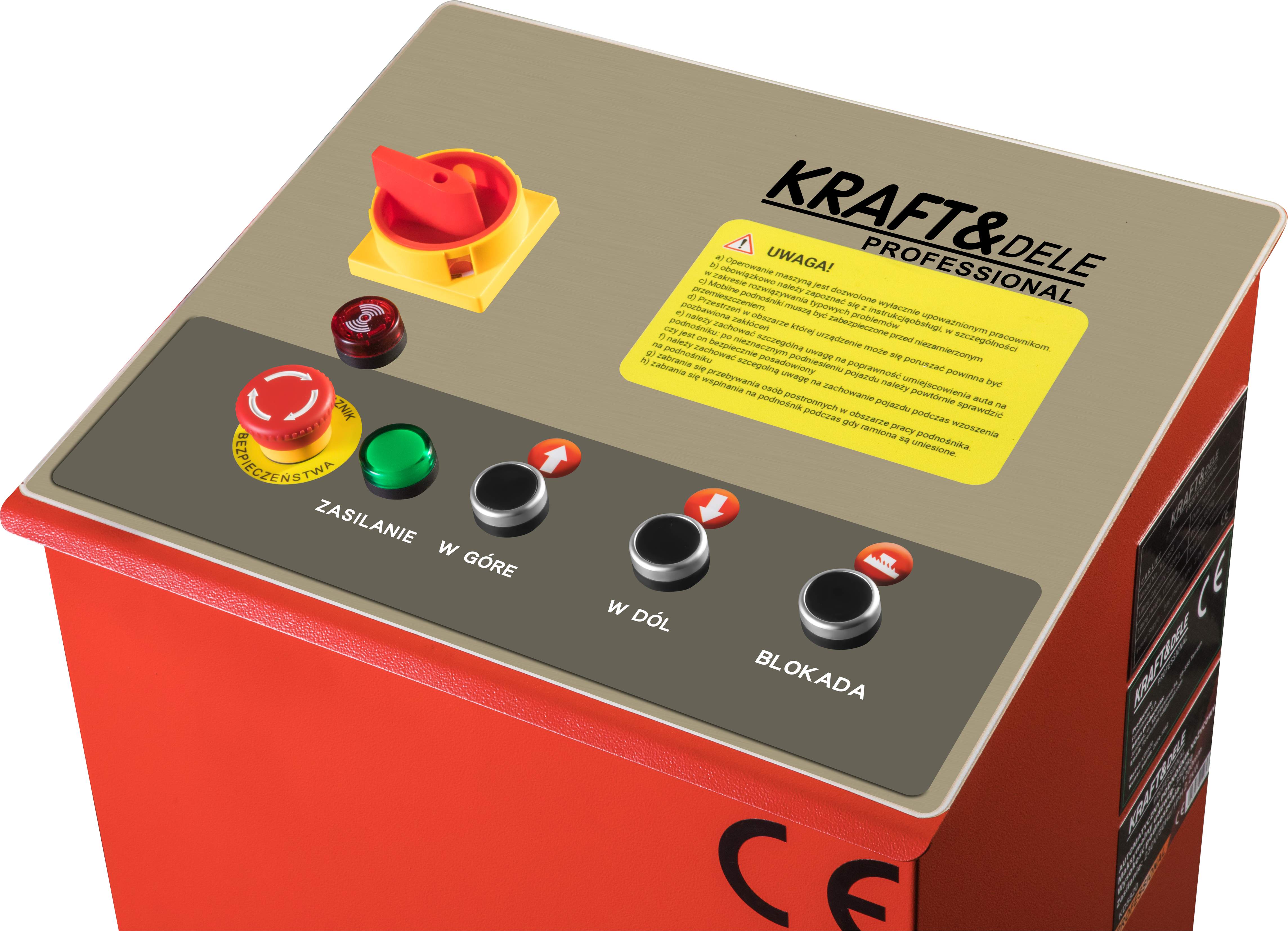 Model KD5820 został wyposażony w intuicyjny panel sterowania, na którym znajduje się główny wyłącznik zasilania, przycisk awaryjnego zatrzymania, kontrolka zasilania oraz osobne przyciski odpowiedzialne za podnoszenie, opuszczanie i blokadę. Takie rozwiązanie pozwala na wygodne sterowanie pracą podnośnika oraz szybką reakcję podczas obsługi pojazdu. Cicha praca urządzenia dodatkowo zwiększa komfort użytkowania w warunkach warsztatowych.