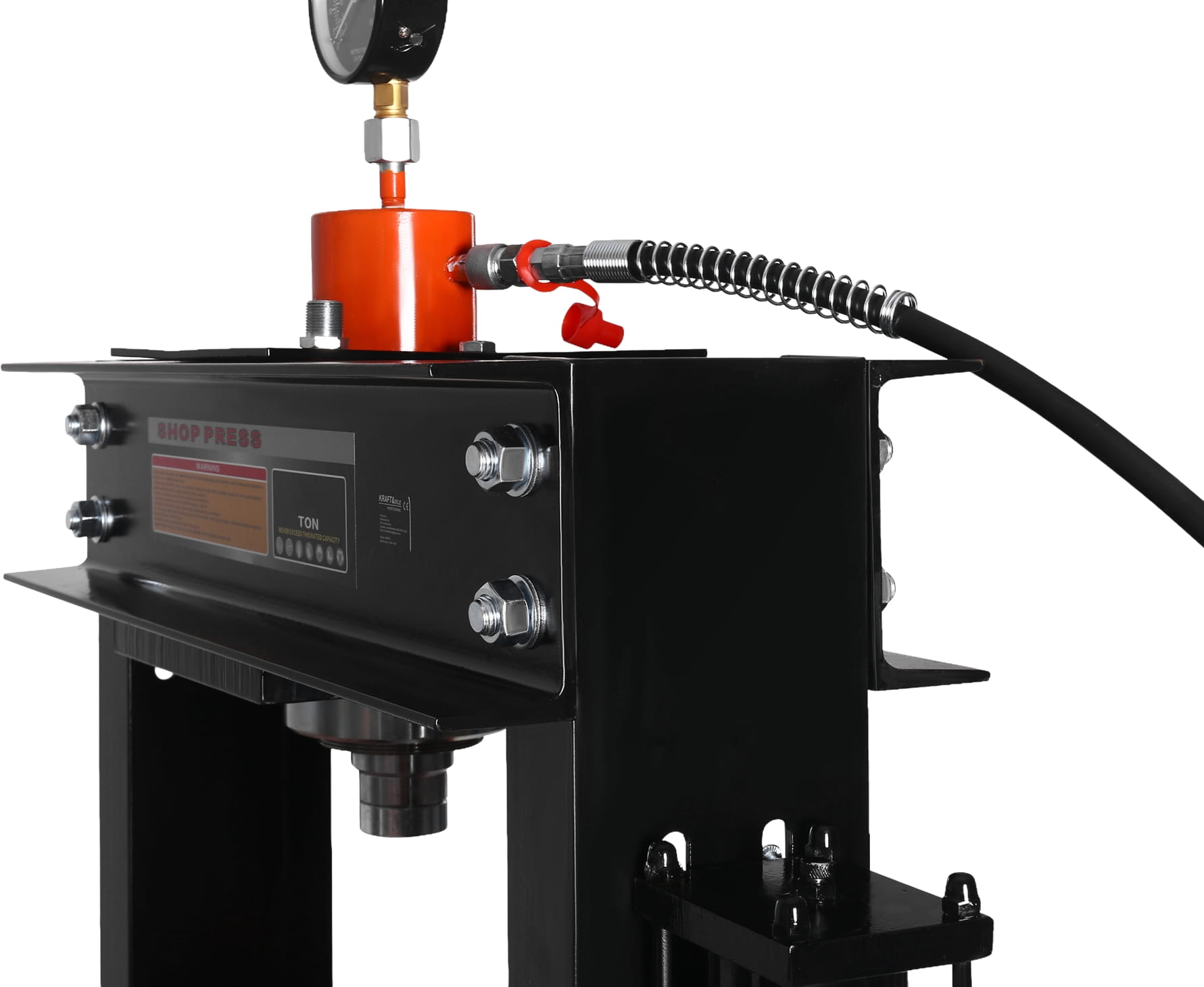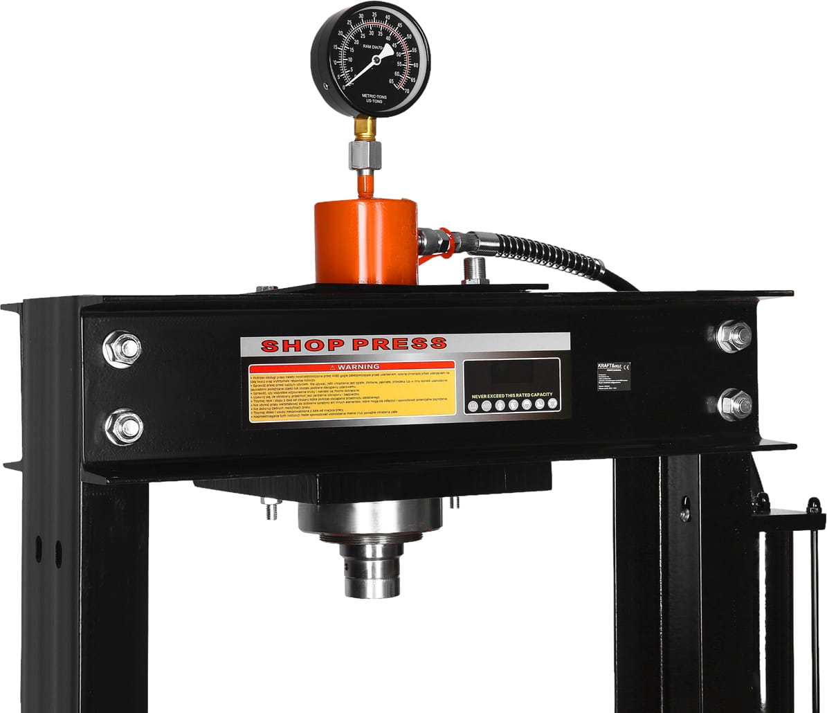 Urządzenie wyposażone jest w wytrzymały wąż hydrauliczny zakończony szybkozłączką, co umożliwia szybkie i wygodne podłączenie układu oraz zwiększa komfort użytkowania. Dodatkowo prasa posiada czytelny manometr, który pozwala na bieżąco kontrolować i mierzyć siłę nacisku, zapewniając precyzję oraz bezpieczeństwo podczas pracy.