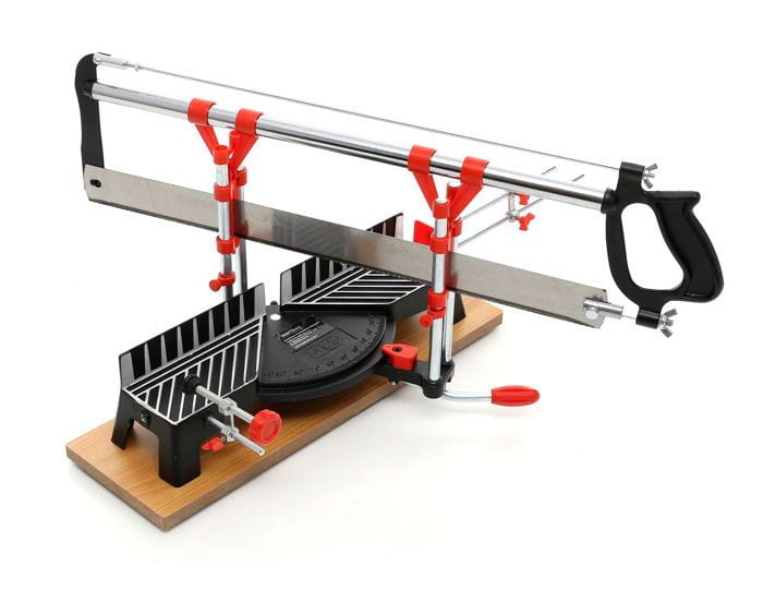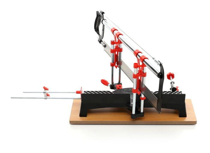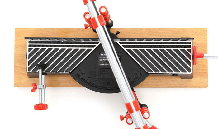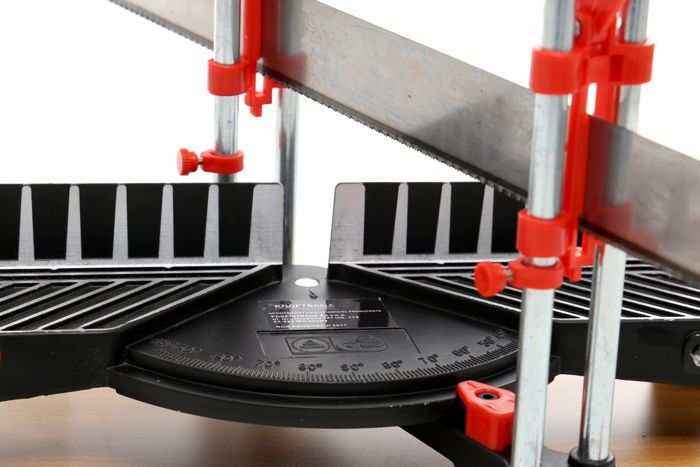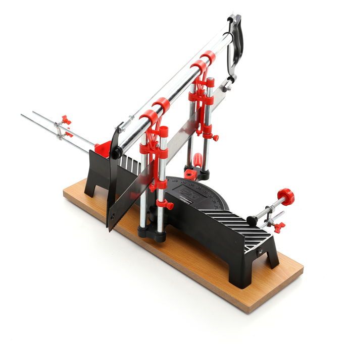 Możliwość ustawienia automatycznych kątów zapadkowych 22,5°, 30°, 36°, 45°, 90° lub ręczne ustawienie kąta według uznania. Osadzona na solidnym, drewnianym blacie z gumowymi nóżkami.