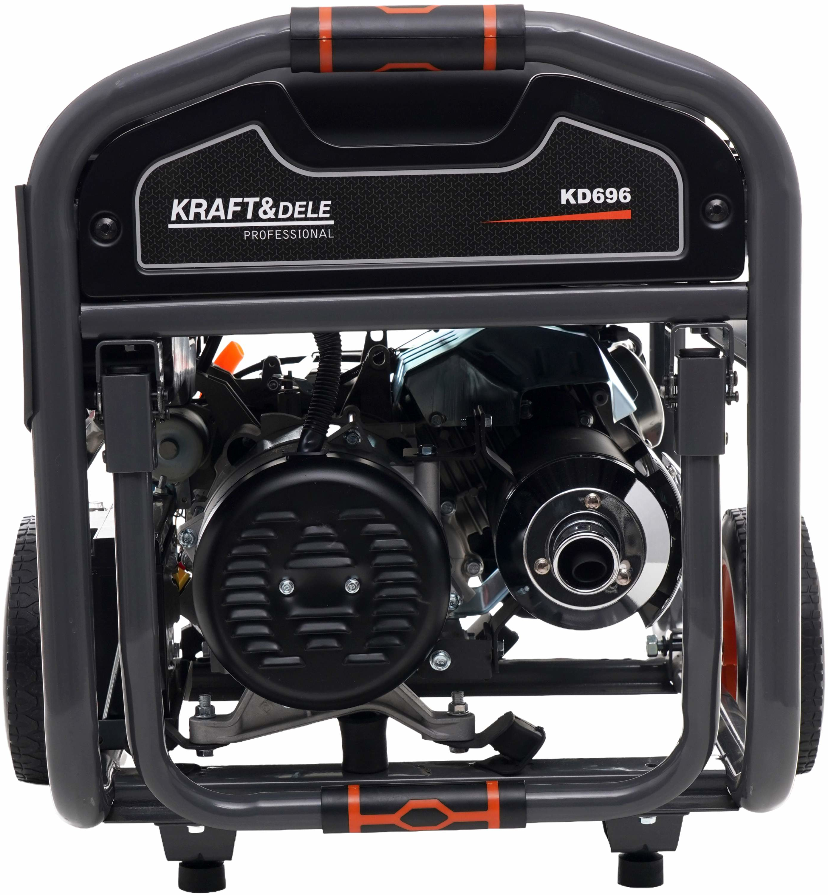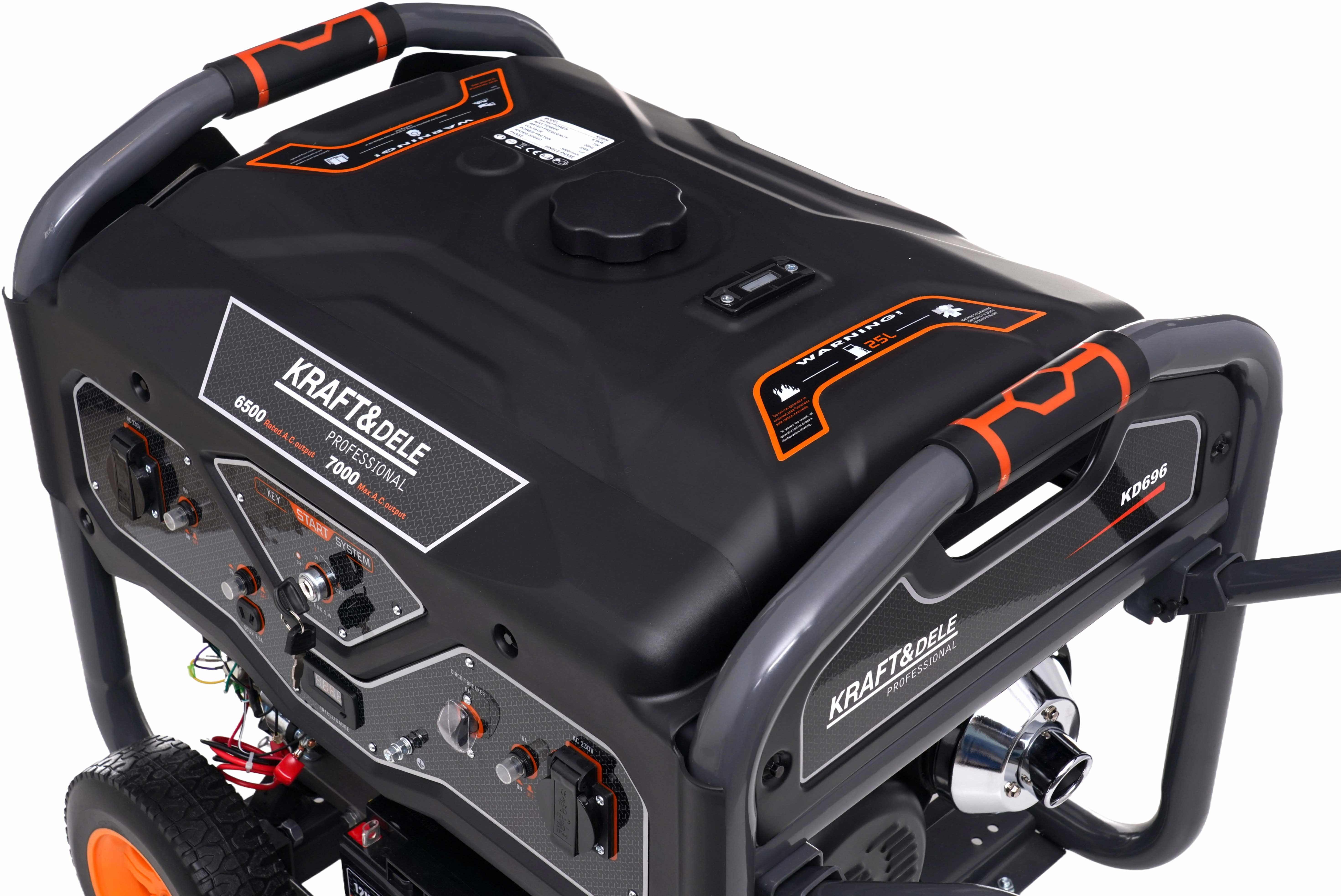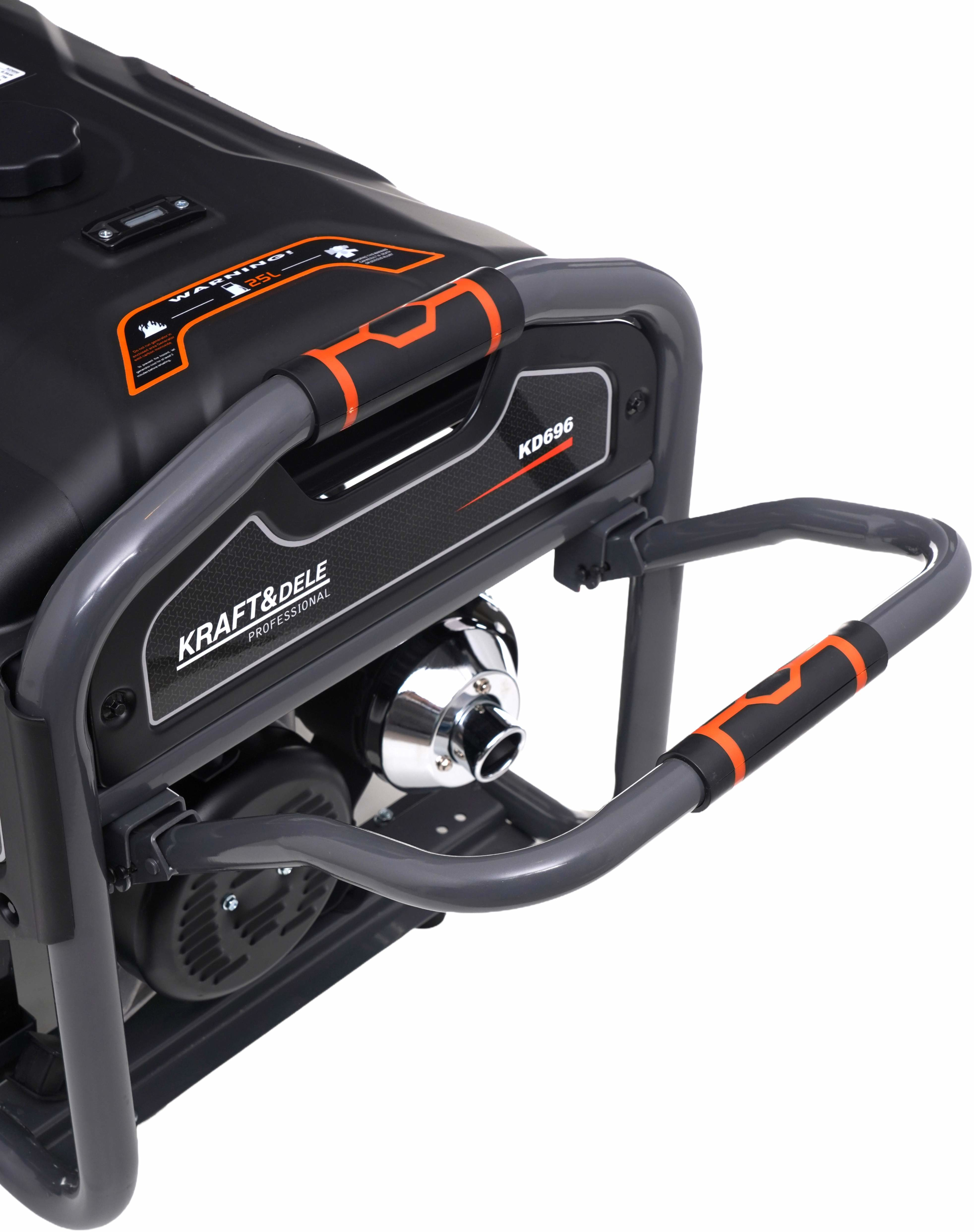 Model KD696 wyposażony jest w niezawodny silnik 4-suwowy OHV oraz konstrukcję typu Open Frame, która zapewnia trwałość, skuteczne chłodzenie oraz łatwy dostęp do podzespołów serwisowych. Agregat posiada system rozruchu KEY START (elektryczny) wspomagany rozruchem ręcznym, co umożliwia szybkie i wygodne uruchomienie urządzenia w każdych warunkach. Wbudowany wyświetlacz cyfrowy umożliwia kontrolę parametrów pracy oraz czasu pracy urządzenia.