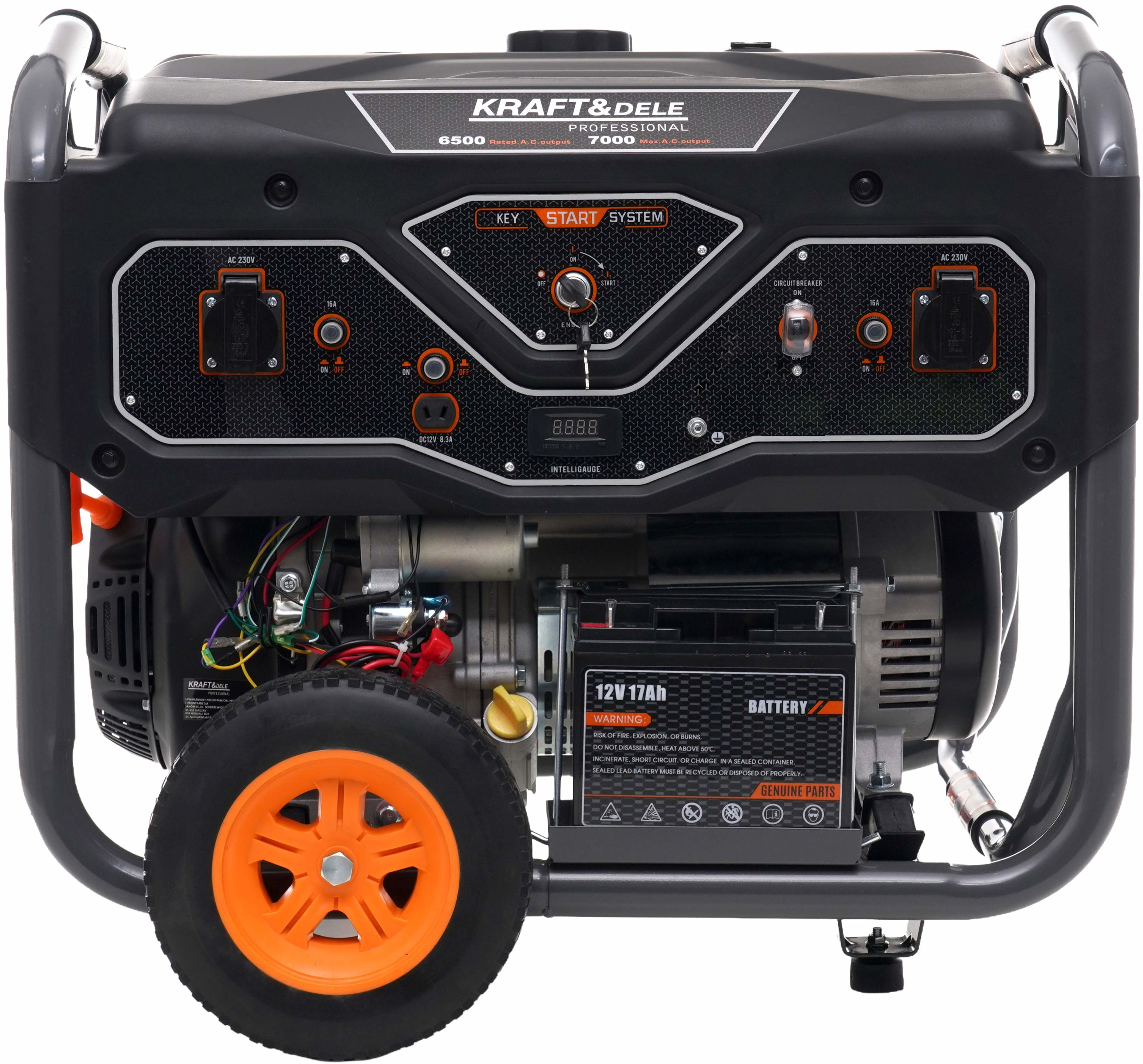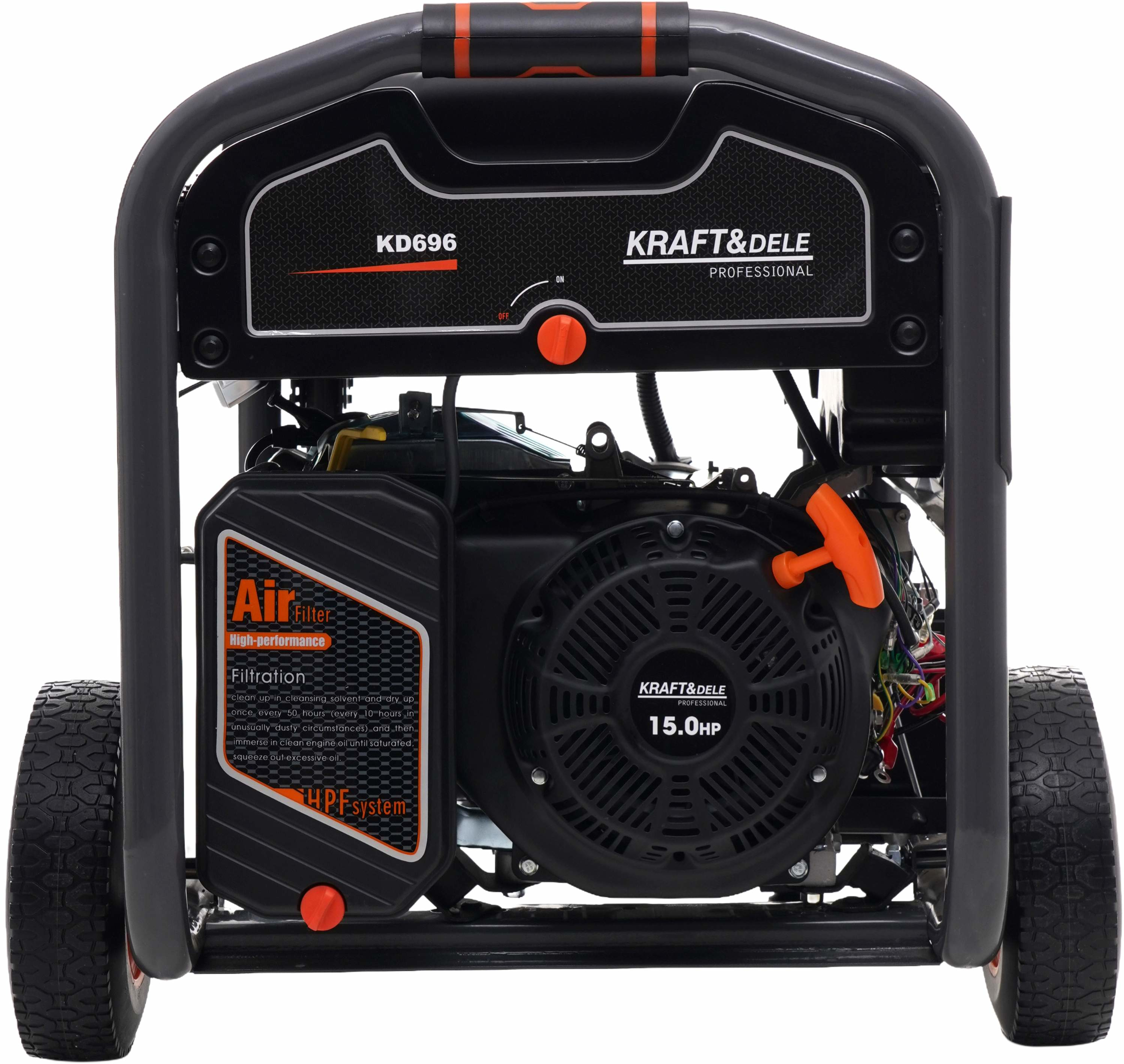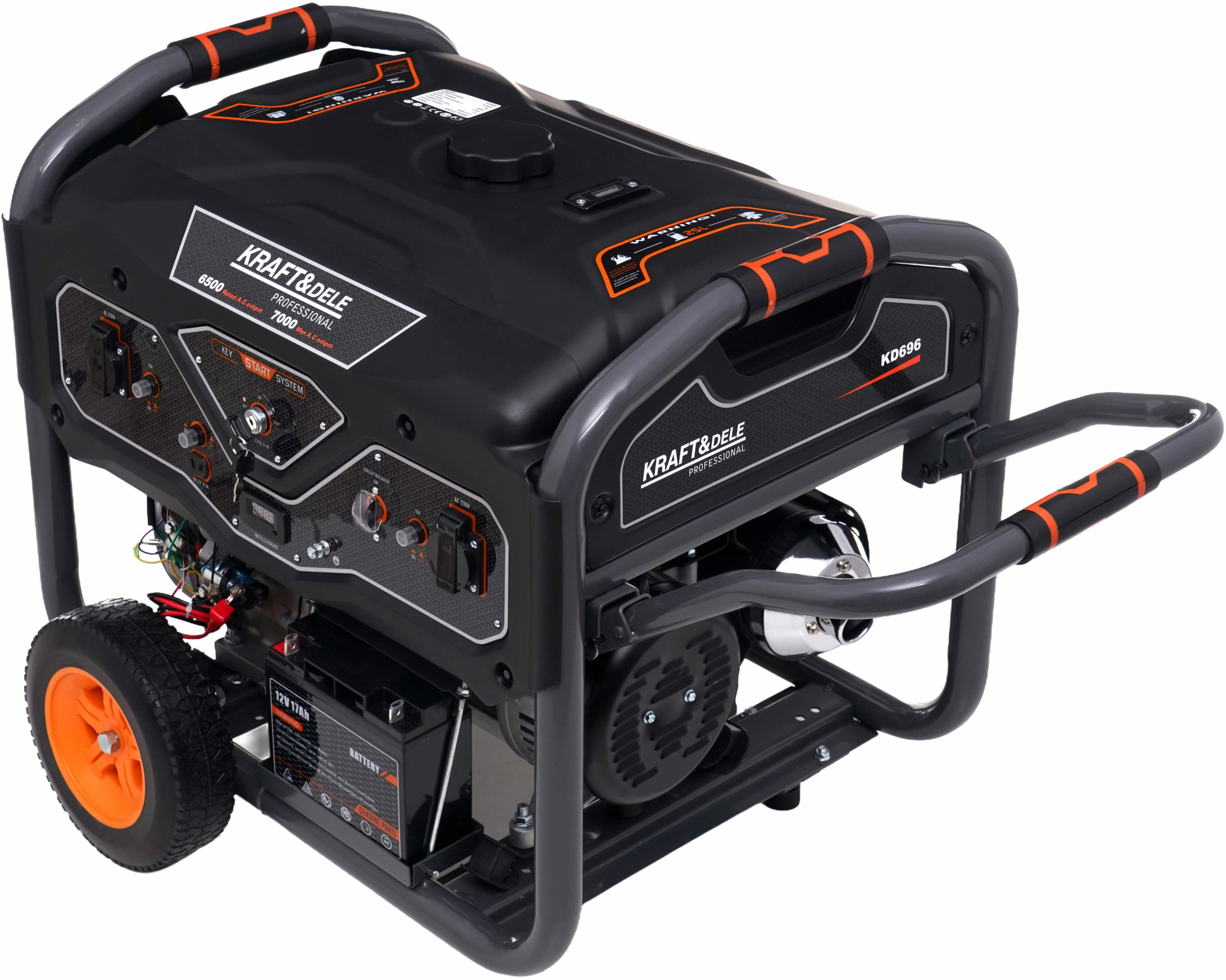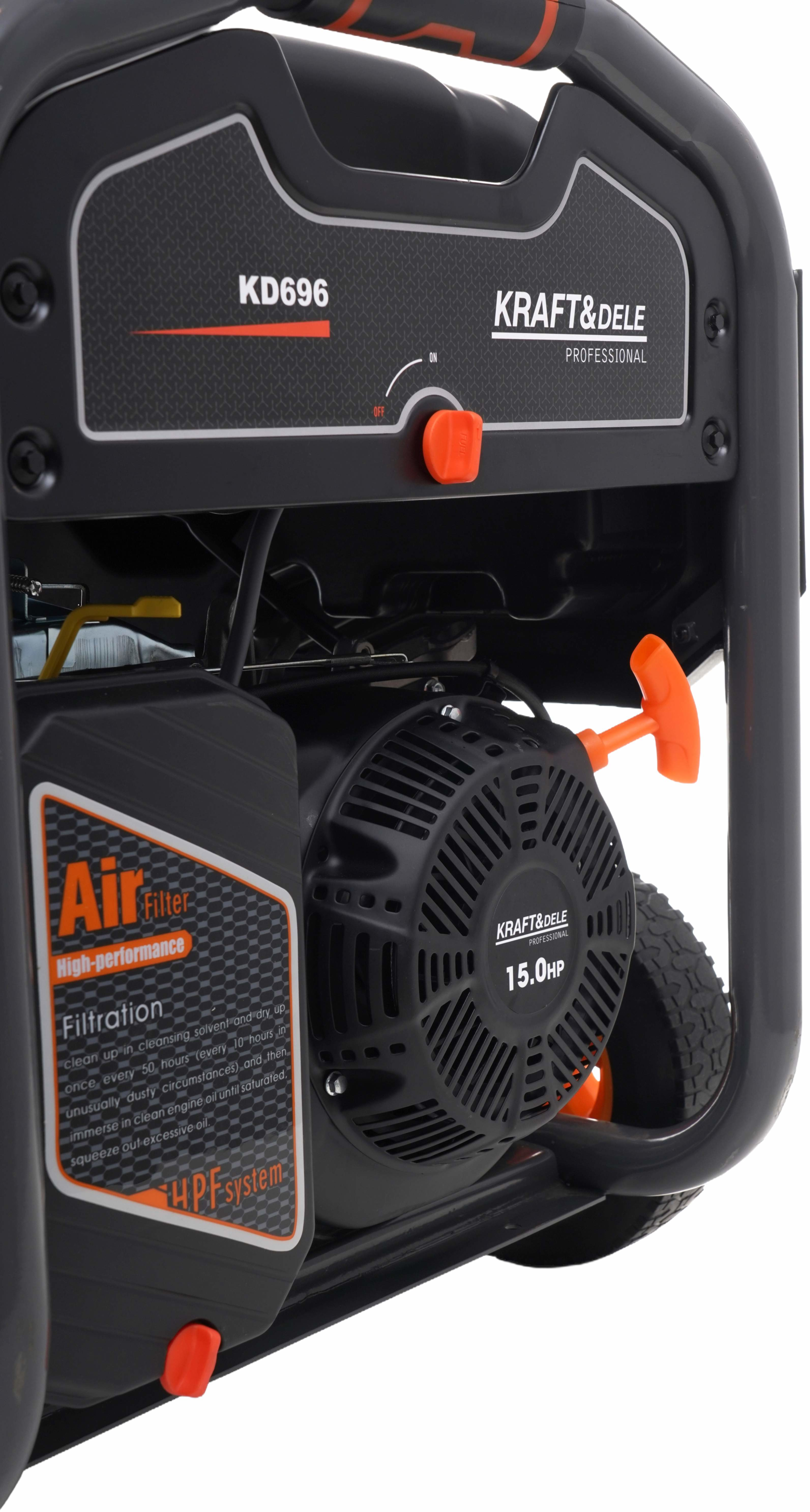 Model KD696 wyposażony jest w niezawodny silnik 4-suwowy OHV oraz konstrukcję typu Open Frame, która zapewnia trwałość, skuteczne chłodzenie oraz łatwy dostęp do podzespołów serwisowych. Agregat posiada system rozruchu KEY START (elektryczny) wspomagany rozruchem ręcznym, co umożliwia szybkie i wygodne uruchomienie urządzenia w każdych warunkach. Wbudowany wyświetlacz cyfrowy umożliwia kontrolę parametrów pracy oraz czasu pracy urządzenia.