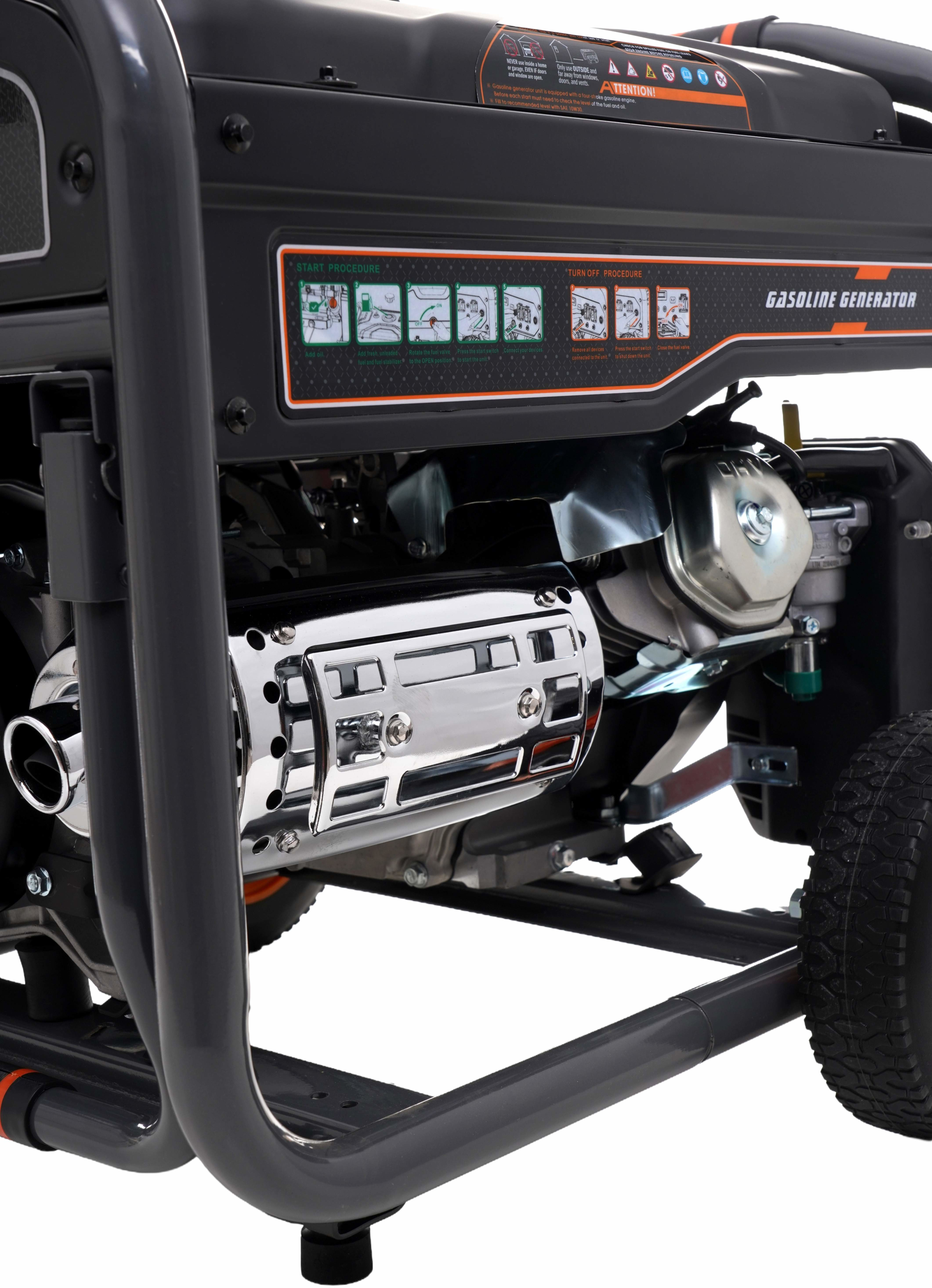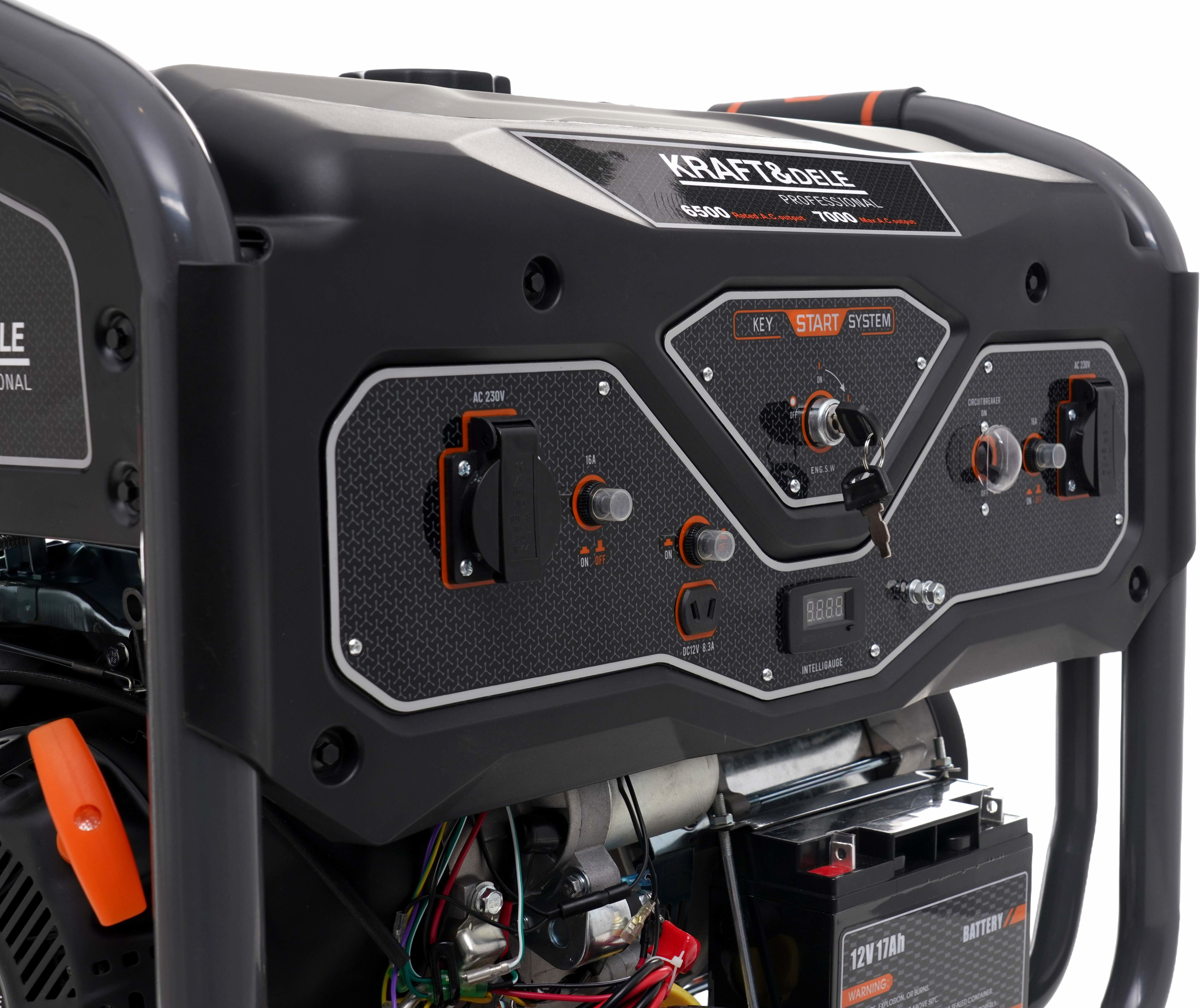 Urządzenie zostało wyposażone w dwa gniazda 230V oraz wyjście DC 12V 8.3A umożliwiające ładowanie akumulatorów. Dodatkowo posiada zabezpieczenie przeciążeniowe, co znacząco zwiększa bezpieczeństwo użytkowania. Na panelu sterowania znajduje się również przełącznik ON/OFF oraz intuicyjny układ elementów sterujących. W górnej części zbiornika umieszczono praktyczny wskaźnik poziomu paliwa, który umożliwia szybką kontrolę ilości paliwa bez konieczności odkręcania korka.