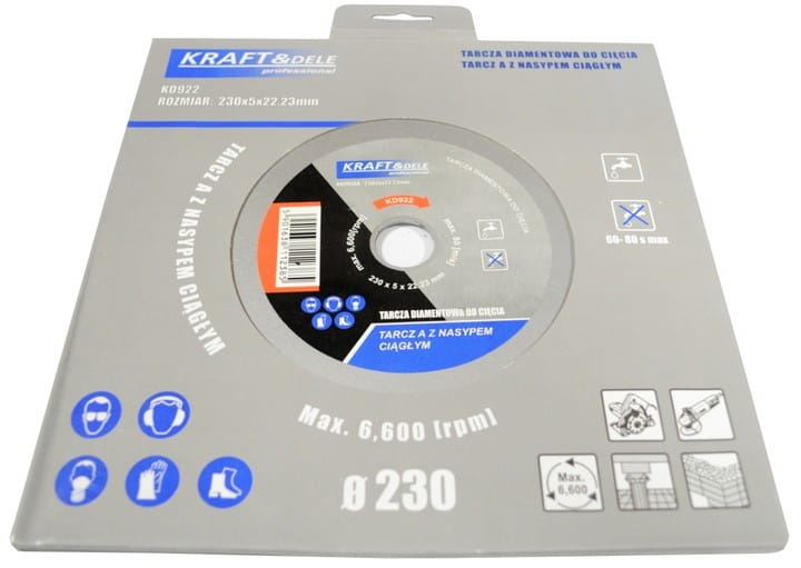 | Cechy: • Wysoka jakość cięcia. • Odporność na pęknięcia. • Uniwersalne zastosowanie na sucho i mokro. • Wysoka prędkość kątowa. • Stabilny korpus tarczy. • Rozmiar: 230 x 5 x 22,23 mm. • Max prędkość obrotowa: 6600 rpm. • Do cięcia materiałów budowlanych. • Produkt marki KRAFT&DELE. • Wysoka wydajność cięcia. | Skład zestawu • Tarcza diamentowa do cięcia KD922 • Oryginalne opakowanie • Paragon lub FV. |