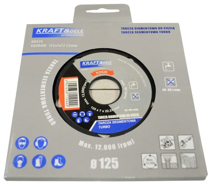| Cechy: • Tarcza diamentowa segmentowa TURBO do cięcia betonu. • Rozmiar: 125 x 7 x 22,23 mm. • Max prędkość obrotowa: 12000 rpm. • Wysokość części tnącej: 7 mm. • Grubość części tnącej: 2 mm. • Odporność na pęknięcia dzięki diamentowi klasy JR4. • Stabilny korpus tarczy dla optymalnego ruchu obrotowego. • Dodatkowe nacięcia zapewniające lepsze chłodzenie i wydłużenie żywotności. • Do cięcia materiałów budowlanych, w tym betonu, dachówek, cegieł, ceramiki. • Produkt marki KRAFT&DELE. • Oryginalne opakowanie w zestawie. | Skład zestawu • Tarcza diamentowa wentylowana do cięcia KD926 • Oryginalne opakowanie (cały karton = 100 sztuk) • Paragon lub FV. |