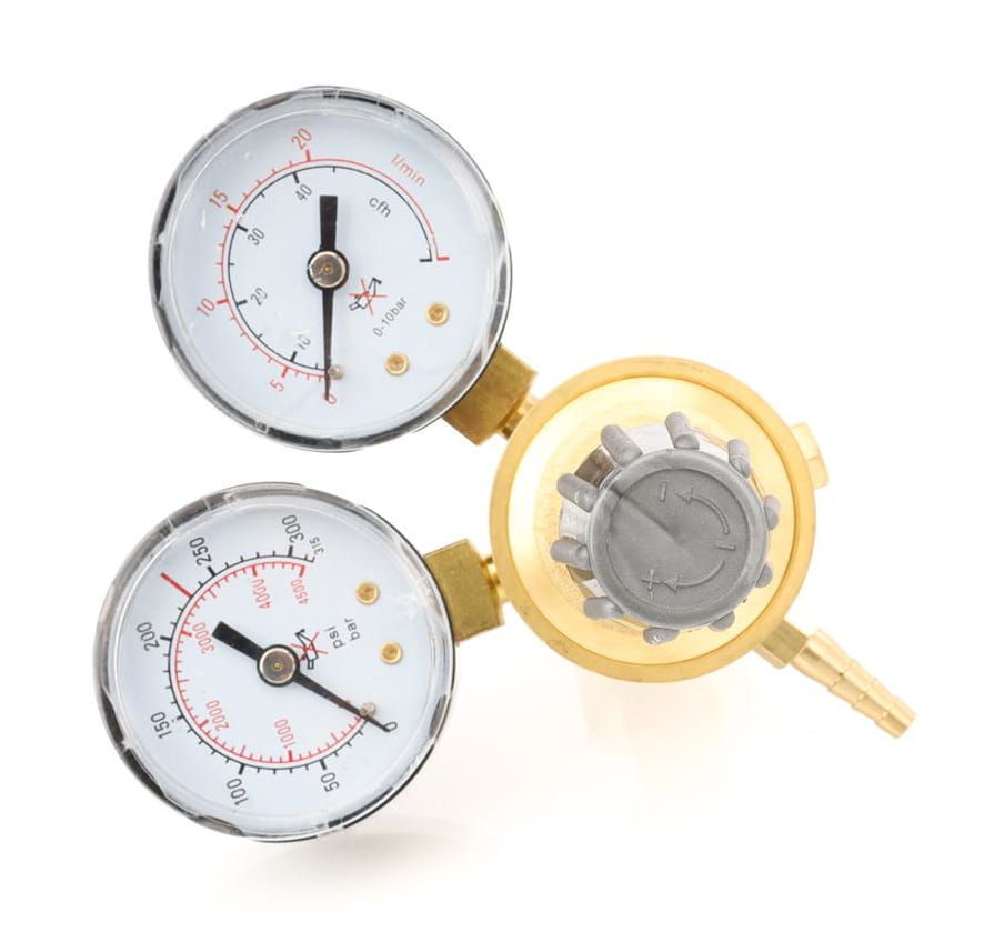 Posiada dwa manometry pozwalające na bieżąco śledzić parametry pracy oraz śrubę nastawną. Umożliwia to dostosowanie parametrów do wybranej metody spawania.