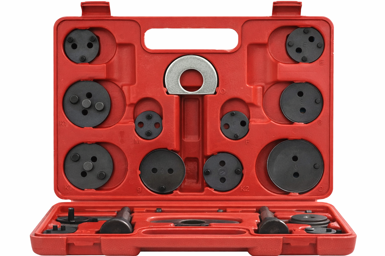 Zestaw został wykonany z wysokiej jakości stali, co zapewnia jego trwałość i odporność na intensywną eksploatację. W komplecie znajdują się dwie prasy – prawo- i lewoskrętna – a także szeroki wybór adapterów dopasowanych do różnych systemów hamulcowych stosowanych w samochodach europejskich i azjatyckich. Całość zapakowana jest w praktyczną walizkę ułatwiającą przechowywanie i transport.