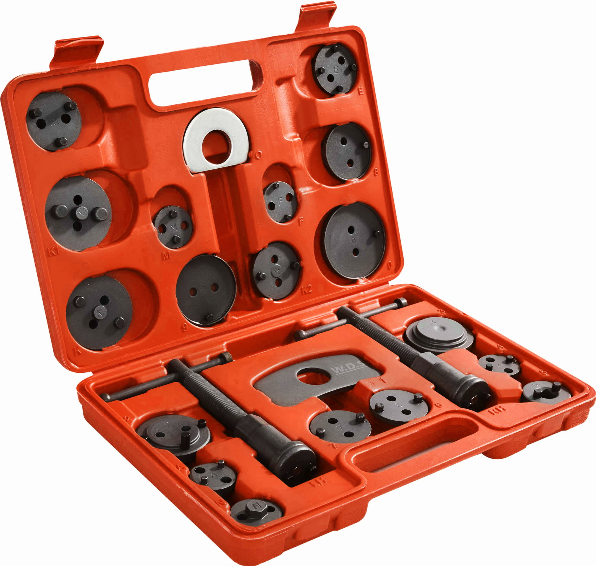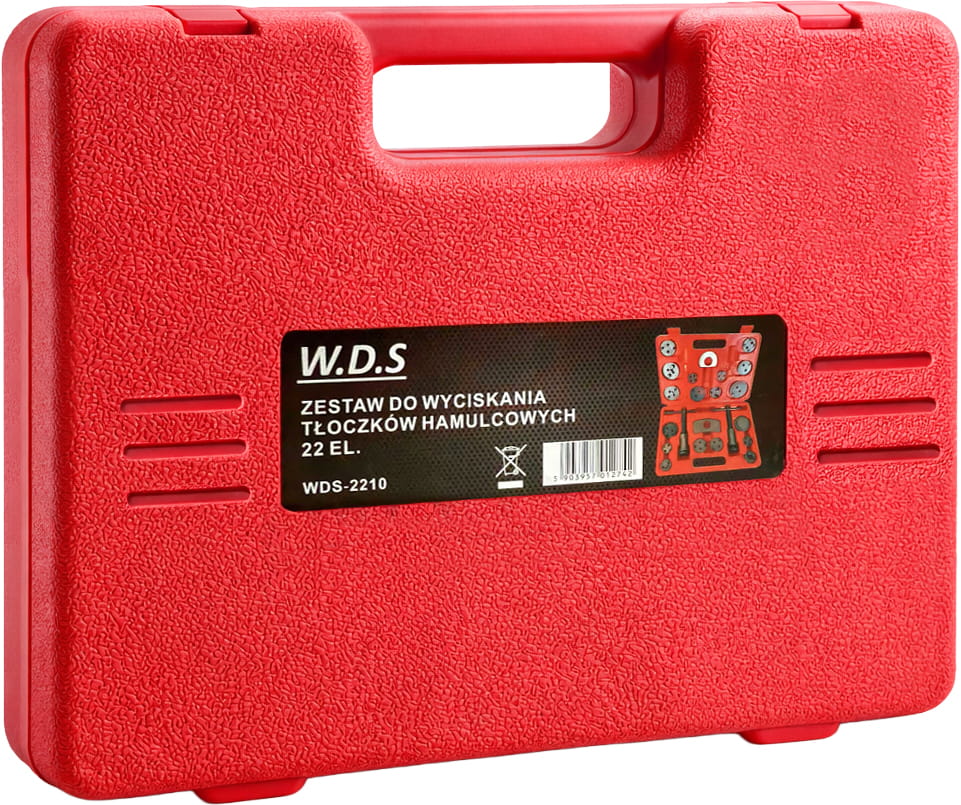 Profesjonalny zestaw do wyciskania tłoczków hamulcowych WDS2210 marki Kraft&Dele to niezastąpione narzędzie podczas serwisowania układów hamulcowych w pojazdach wyposażonych w hamulce tarczowe. Umożliwia sprawne i bezpieczne cofanie tłoczków hamulcowych, co jest niezbędne przy wymianie klocków hamulcowych oraz pracach serwisowych.