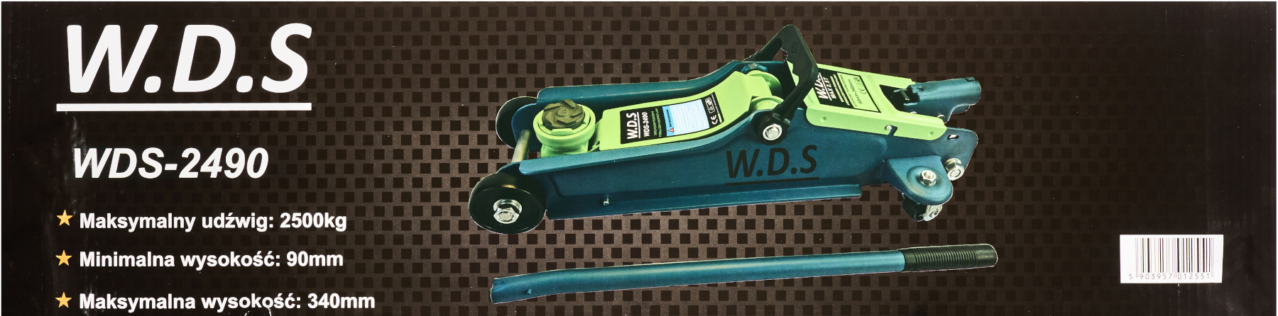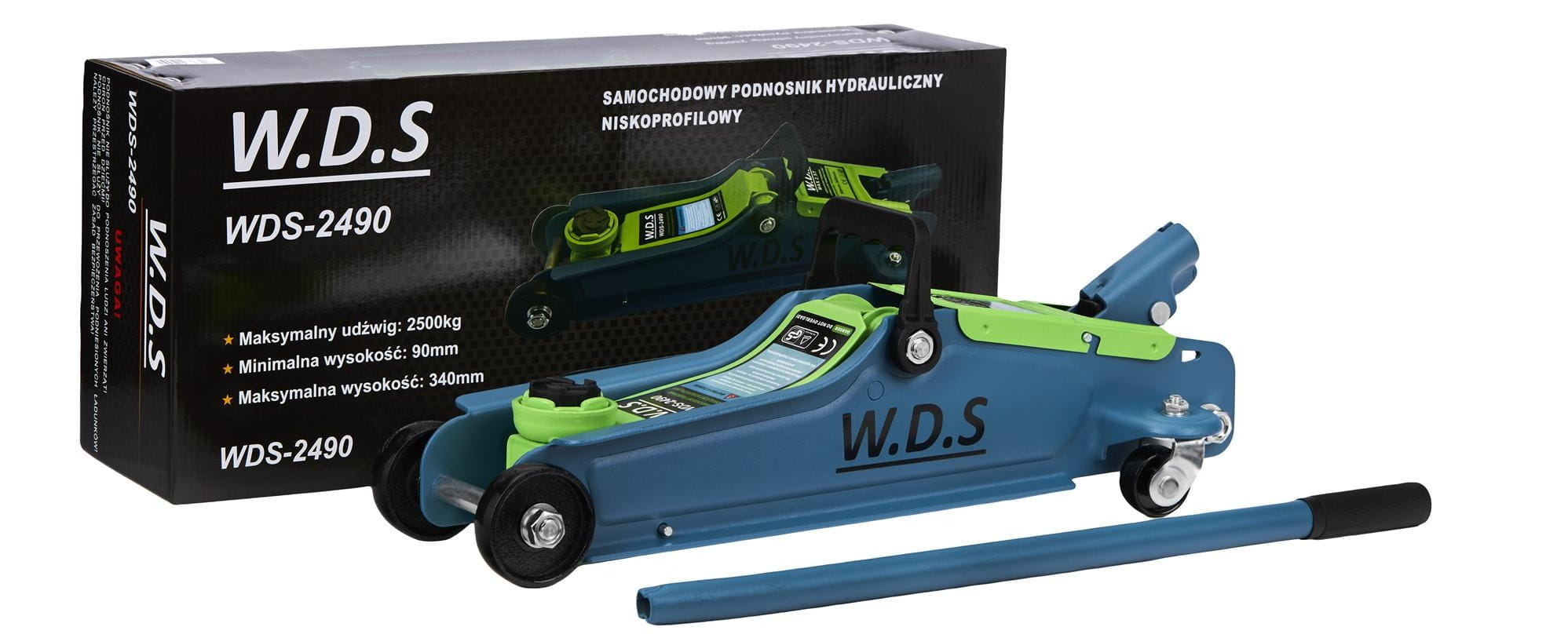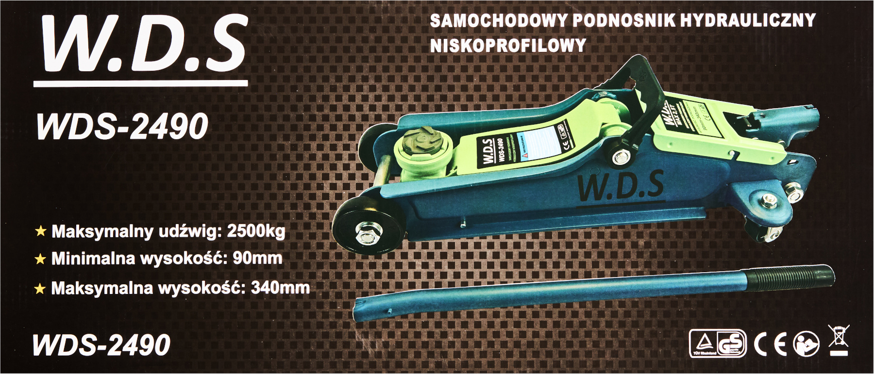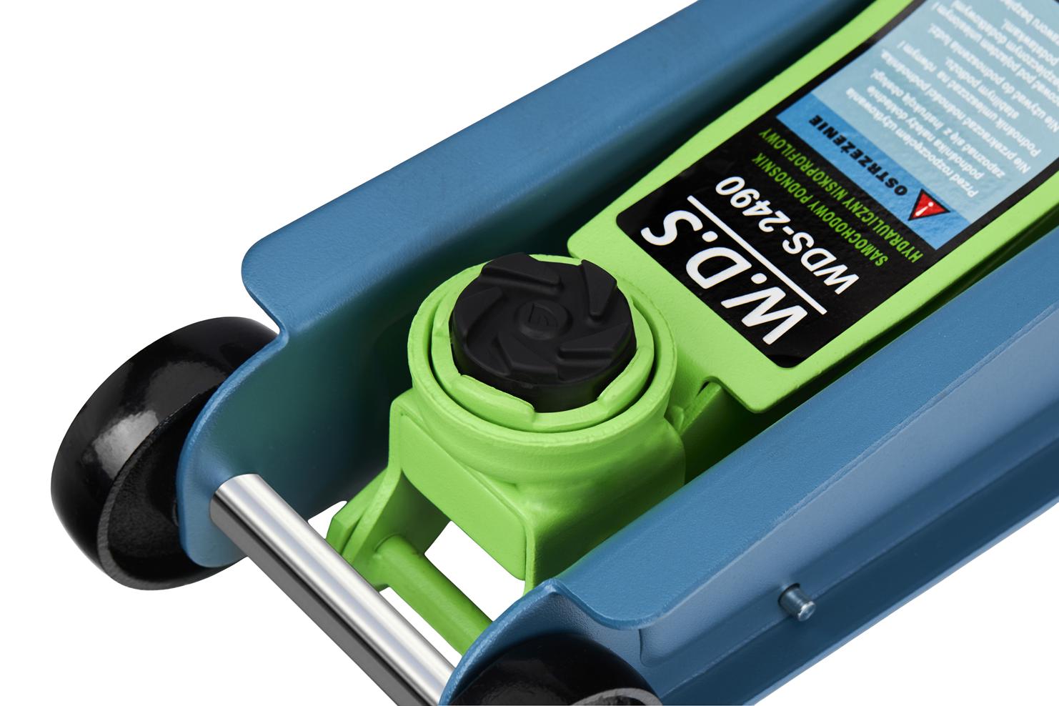 WDS2490 marki W.D.S to solidny podnośnik niskoprofilowy przeznaczony do szybkiego i bezpiecznego unoszenia samochodów osobowych oraz dostawczych. Dzięki zakresowi podnoszenia od 90 mm do 340 mm idealnie nadaje się do pracy przy pojazdach o obniżonym zawieszeniu.