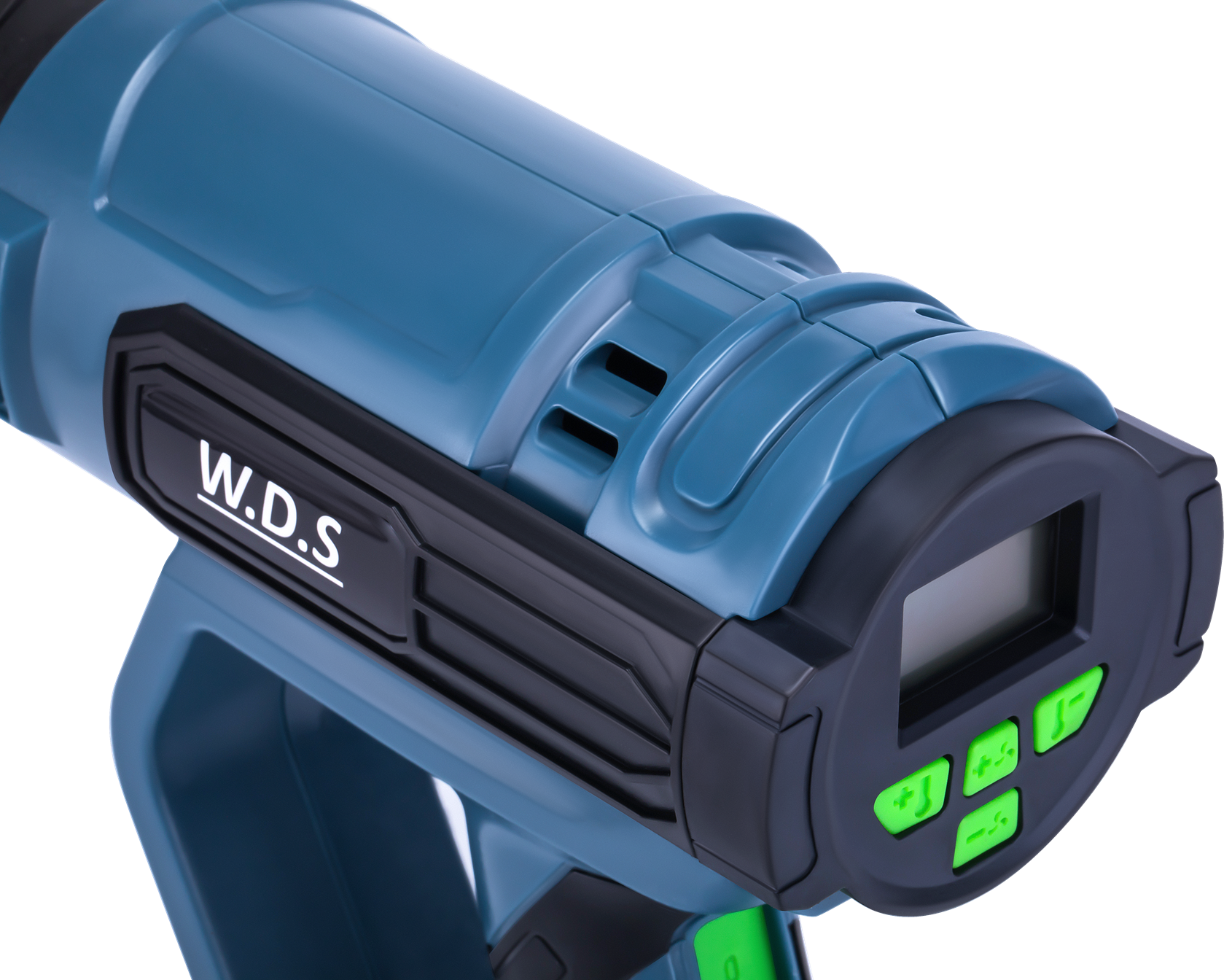 Model WDS2510 oferuje możliwość regulacji mocy nadmuchu, co umożliwia dostosowanie prędkości nawiewu do aktualnie wykonywanej pracy. Pełna regulacja temperatury oraz mocy nawiewu sprawia, że urządzenie jest niezwykle precyzyjne i doskonale sprawdzi się zarówno w przydomowym garażu, jak i w profesjonalnym warsztacie. Opalarka wyposażona jest w panel sterowania z wyświetlaczem LCD, za pomocą którego można ustawić temperaturę w zakresie od 50°C do 650°C z dokładnością co 10°C. Dwa dodatkowe przyciski pozwalają na regulację mocy nawiewu w 5 poziomach – od najniższego do najwyższego. Ekran LCD pokazuje zarówno temperaturę ustawioną, jak i aktualną, a także wybrany poziom mocy nawiewu, zapewniając pełną kontrolę nad procesem pracy.