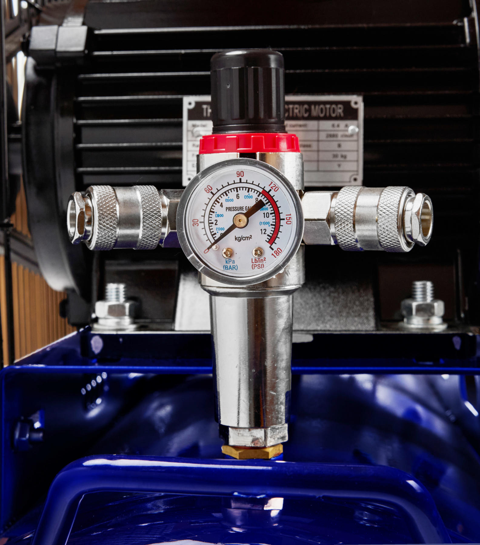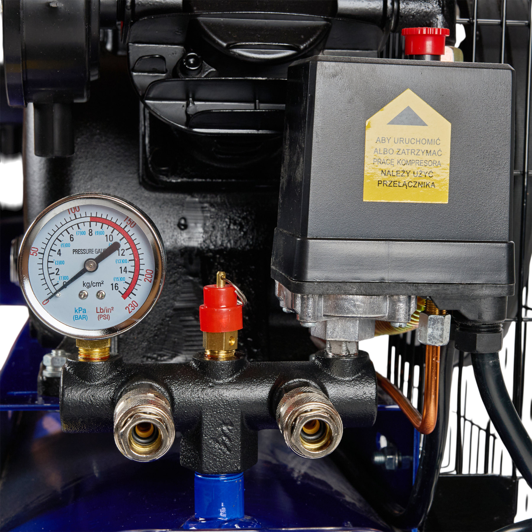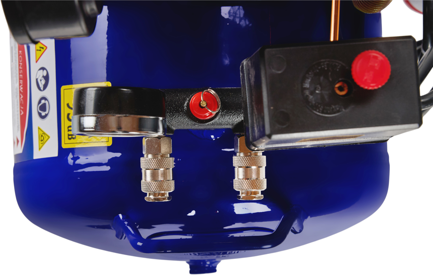 Dodatkowo zastosowano specjalny system tłumiący, który skutecznie redukuje hałas pracy urządzenia. Solidnie zaprojektowany zbiornik powietrza zapewnia bezpieczeństwo użytkowania i niezawodność podczas długotrwałej pracy. Kompresor został rownież wyposażony w dwa wejścia na szybkozłączkę, co umożliwia jednoczesne podłączenie kilku narzędzi pneumatycznych. Cztery solidne kółka oraz dwa ergonomiczne uchwyty transportowe pozwalają na łatwe przemieszczanie urządzenia, nawet w warunkach warsztatowych, gdzie liczy się mobilność i wygoda pracy.