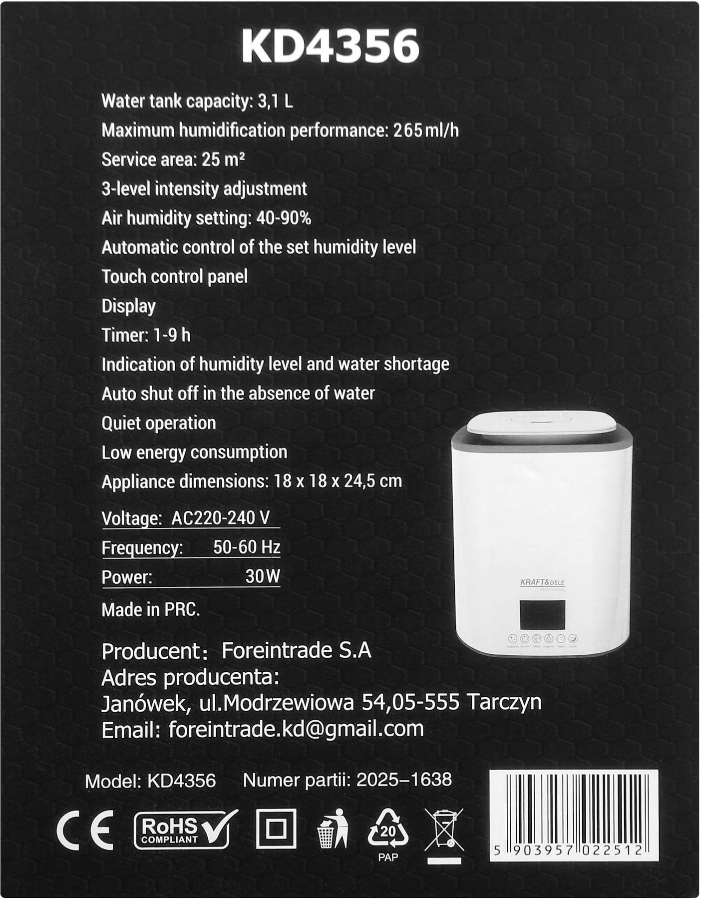 | ⚙️ Regulacja wilgotności | 40% - 90% |