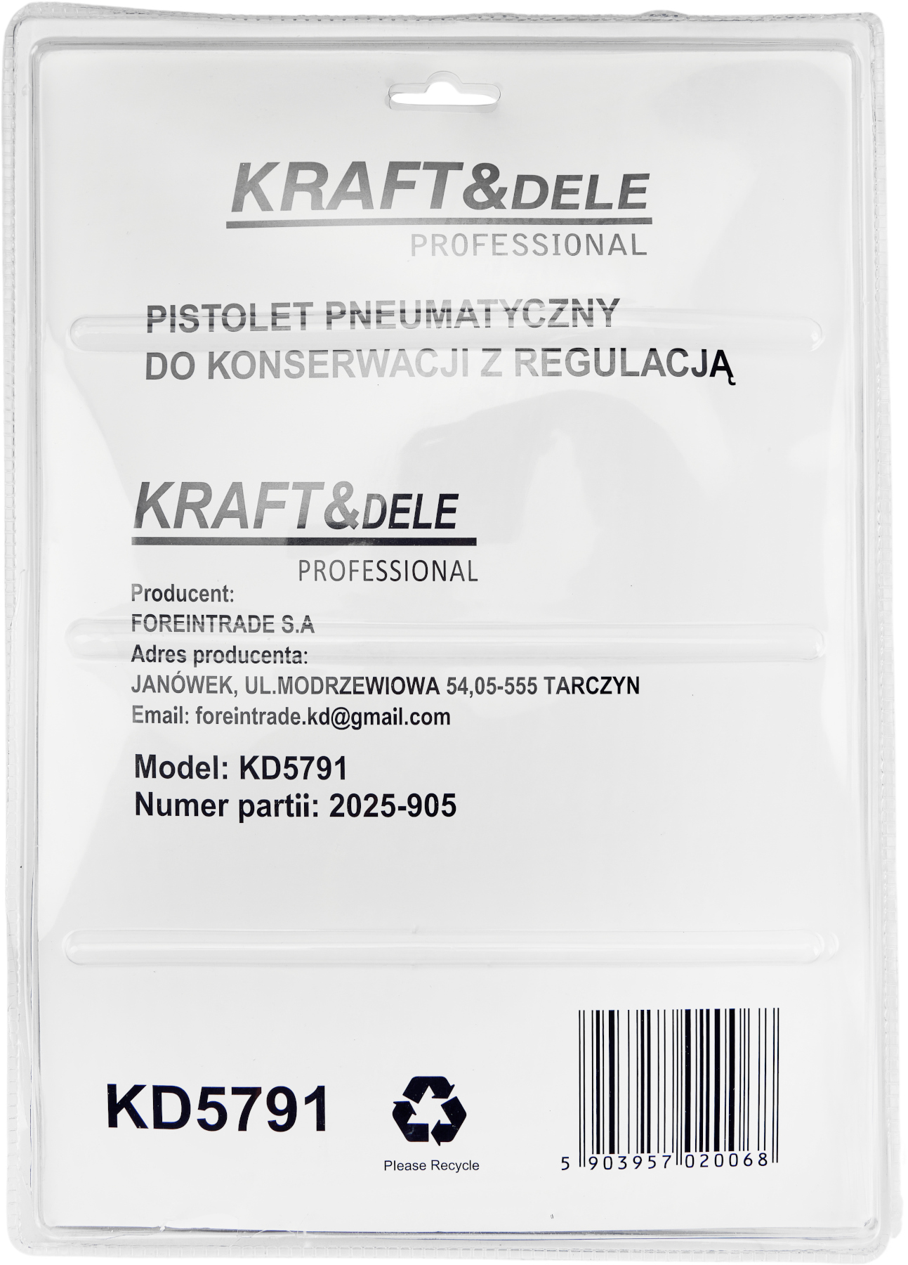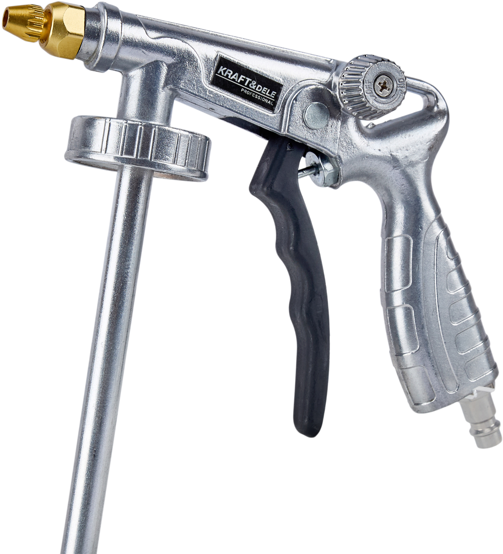 Korpus pistoletu wykonany został z aluminium, co zapewnia niską wagę oraz wysoką odporność na uszkodzenia. Antypoślizgowy uchwyt zwiększa komfort pracy i pewność trzymania nawet podczas dłuższego użytkowania. Model KD5791 pasuje do typowych puszek 1L i 2L z gwintem do tzw. „baranka”. W zestawie znajduje się wężyk zakończony mosiężną końcówką rozpylającą, umożliwiający precyzyjną aplikację preparatów wewnątrz profili zamkniętych.