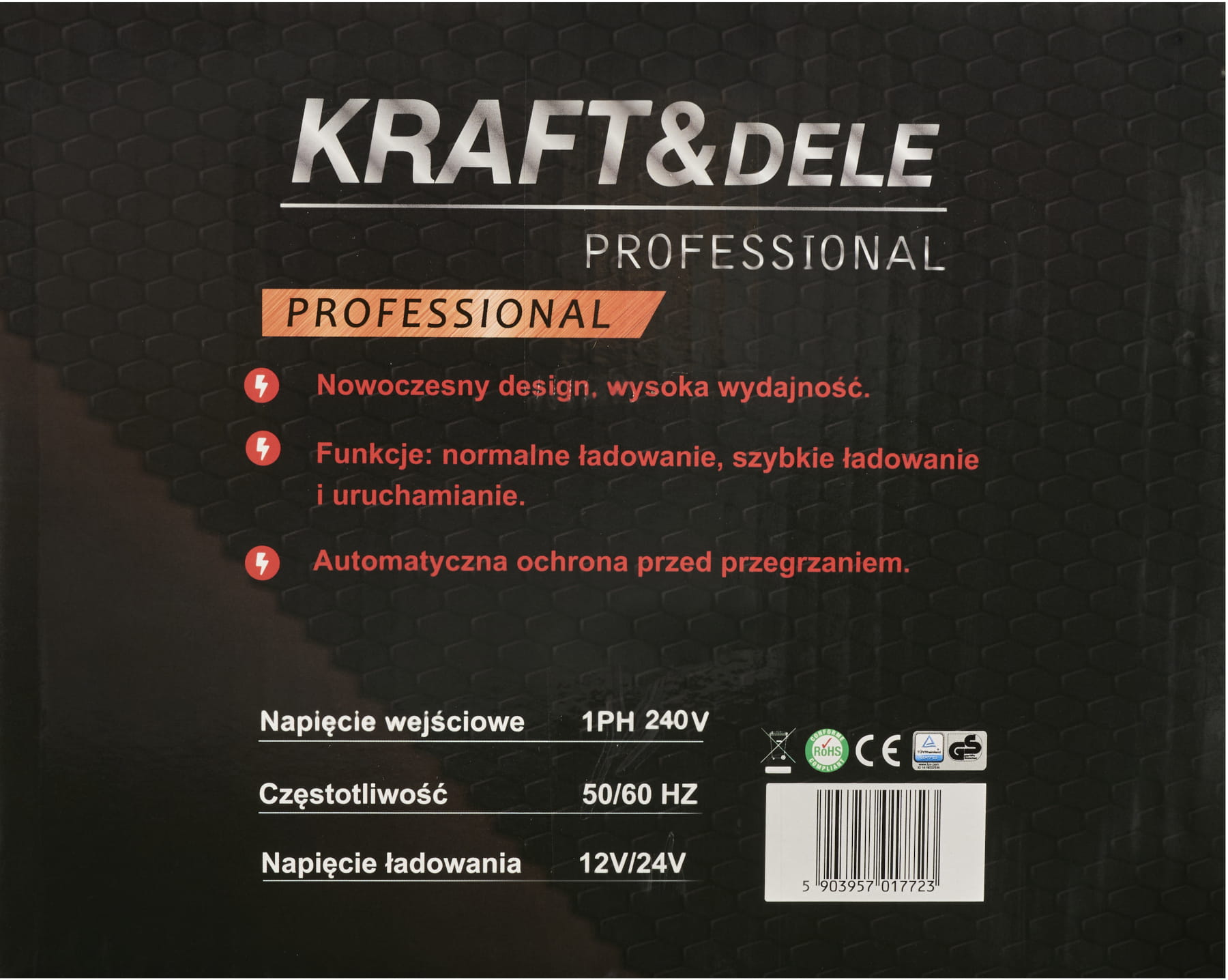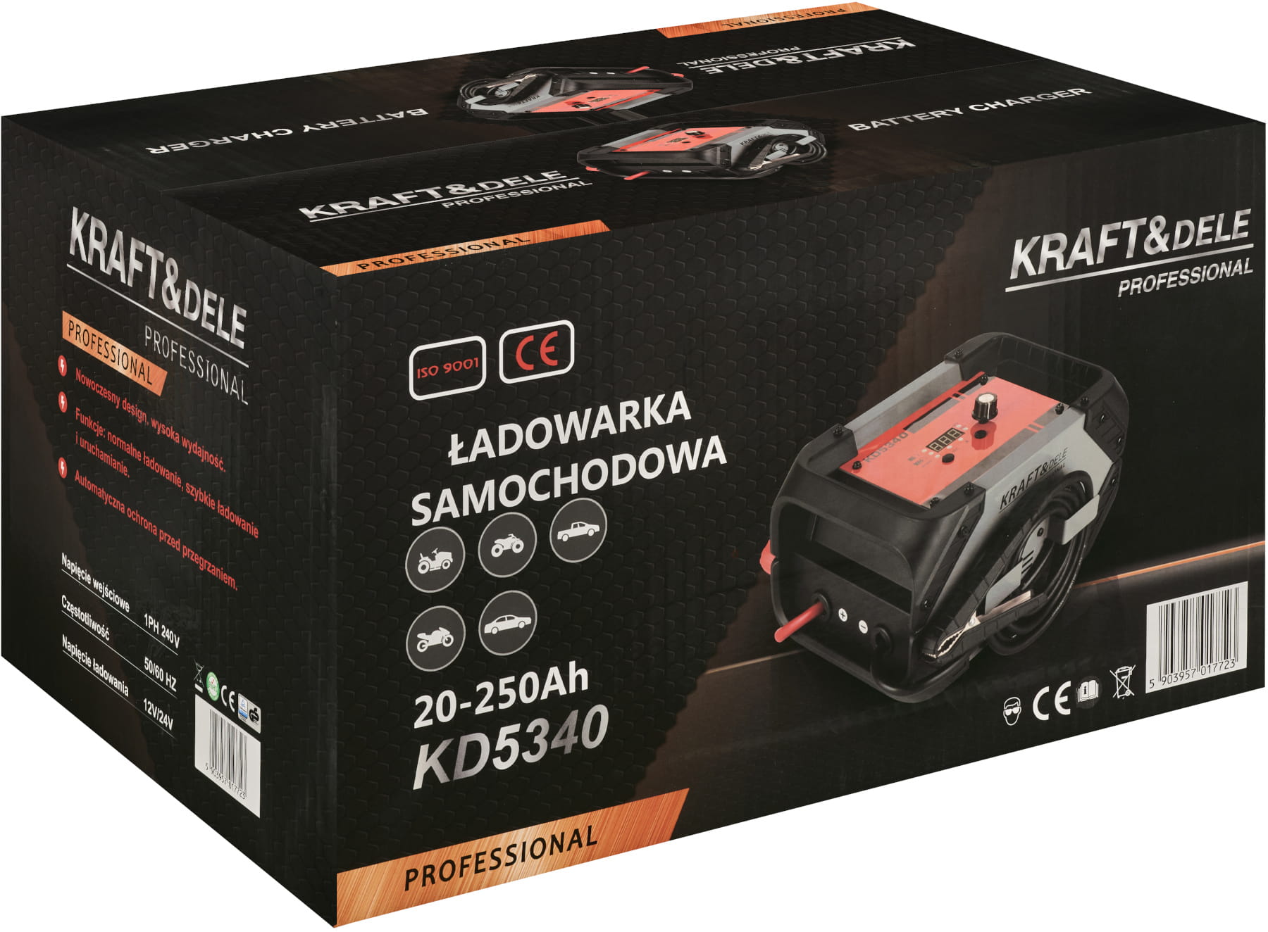 KD5340 to nowoczesna ładowarka samochodowa marki KRAFT&DELE, zaprojektowana do szybkiego i inteligentnego ładowania akumulatorów w pojazdach osobowych, SUV-ach oraz motocyklach. Dzięki zaawansowanej technologii inwerterowej urządzenie pracuje z wydajnością do 90%, zapewniając stabilne i bezpieczne uzupełnianie energii w akumulatorach o pojemności od 20 do 250 Ah.