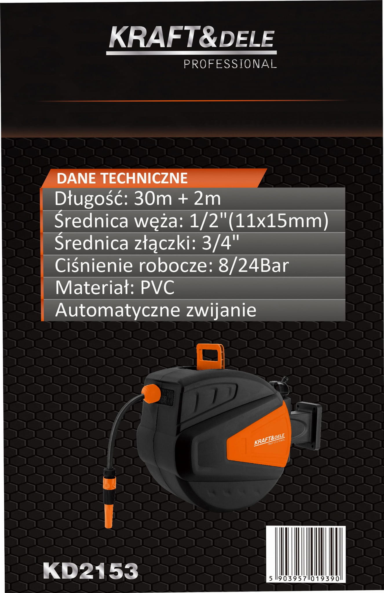 Model KD2153 posiada możliwość montażu na ścianie, dzięki czemu oszczędza miejsce i pozwala utrzymać porządek wokół domu lub garażu. Dodatkowo wyposażony został w uchwyt, co umożliwia swobodne transportowanie bębna. Solidne wykonanie oraz zastosowanie trwałego materiału PVC sprawiają, że produkt sprawdzi się w regularnym użytkowaniu.