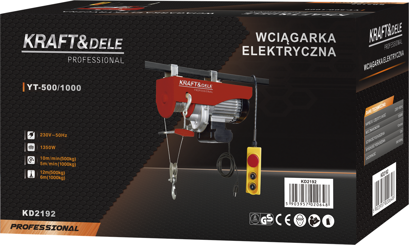 Wyciągarka elektryczna KD2192 marki KRAFT&DELE to solidne i wydajne urządzenie przeznaczone do podnoszenia oraz opuszczania ciężkich przedmiotów. Doskonale sprawdzi się w warsztacie, garażu oraz na budowie, umożliwiając bezpieczne przenoszenie silników, materiałów budowlanych czy ciężkich narzędzi.