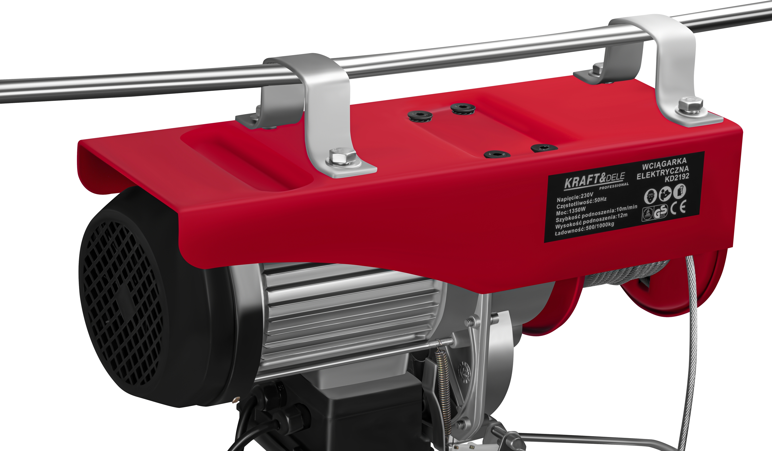 Model KD2192 wyposażony został w mocny silnik o mocy 1350W, który zapewnia sprawną i stabilną pracę bez konieczności częstych przerw. Urządzenie oferuje dwa tryby pracy – z pojedynczym oraz podwójnym hakiem, co pozwala dostosować udźwig do aktualnych potrzeb. Solidna stalowa lina, metalowa obudowa oraz zaawansowany system sterowania przekładają się na trwałość, precyzję obsługi oraz wysoki poziom bezpieczeństwa.