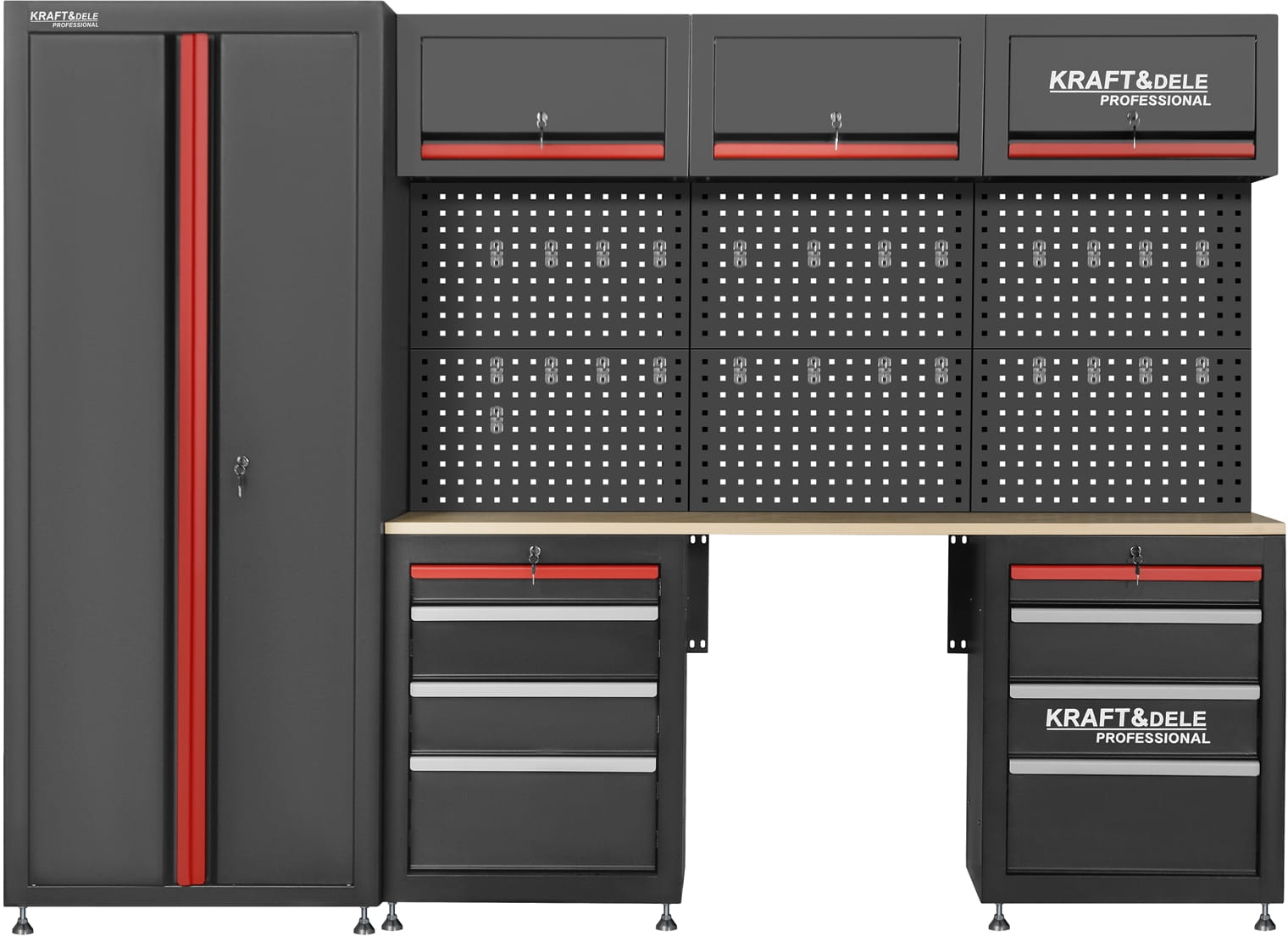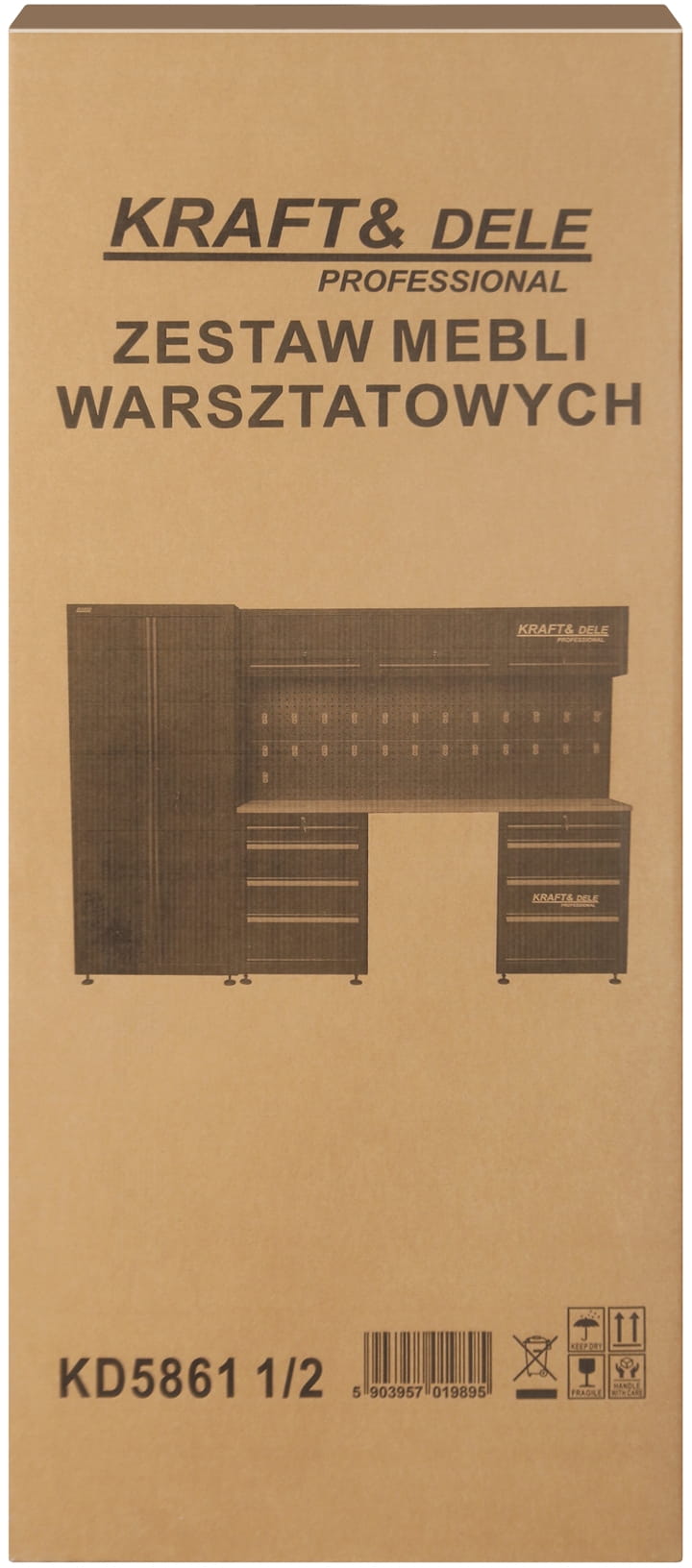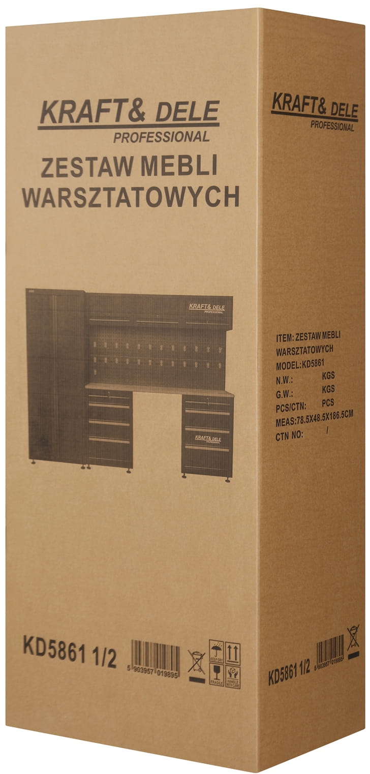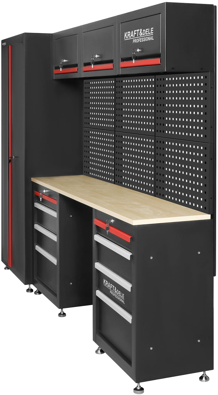 KD5861 to rozbudowany zestaw mebli warsztatowych marki KRAFT&DELE, zaprojektowany z myślą o wygodnej organizacji przestrzeni roboczej w warsztacie, garażu czy pracowni technicznej. Kompletny układ szafek, półek oraz perforowanych paneli pozwala uporządkować narzędzia, akcesoria i materiały w sposób przejrzysty i łatwo dostępny.