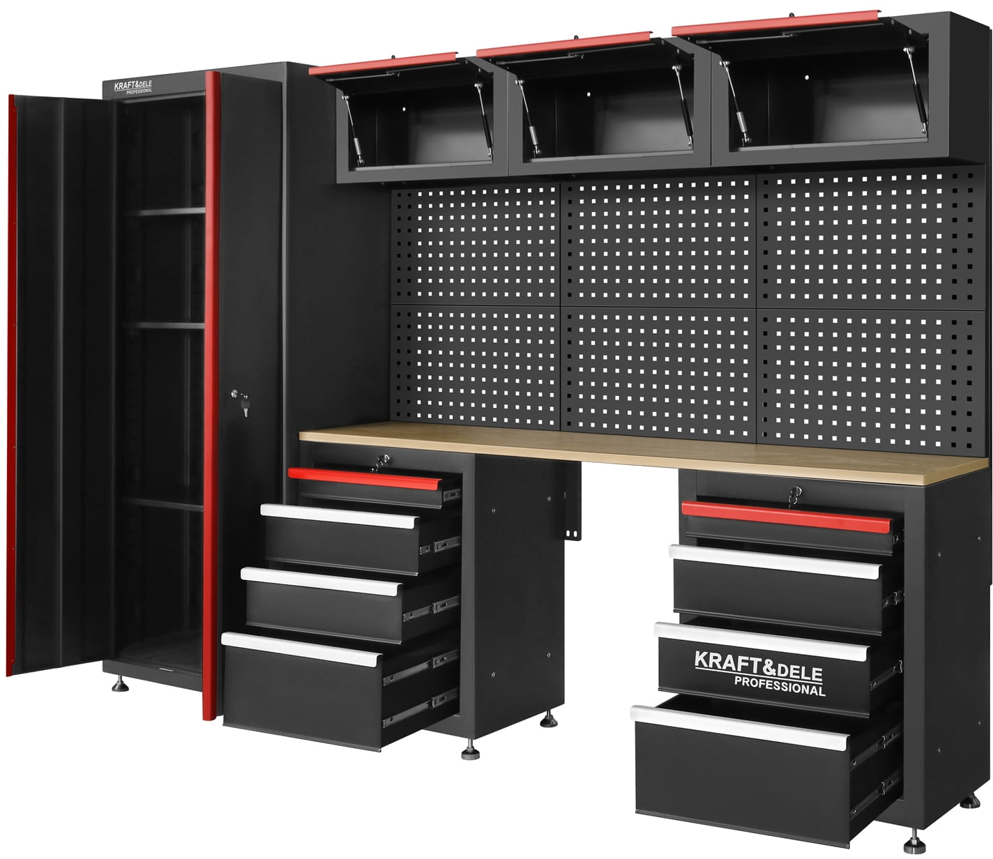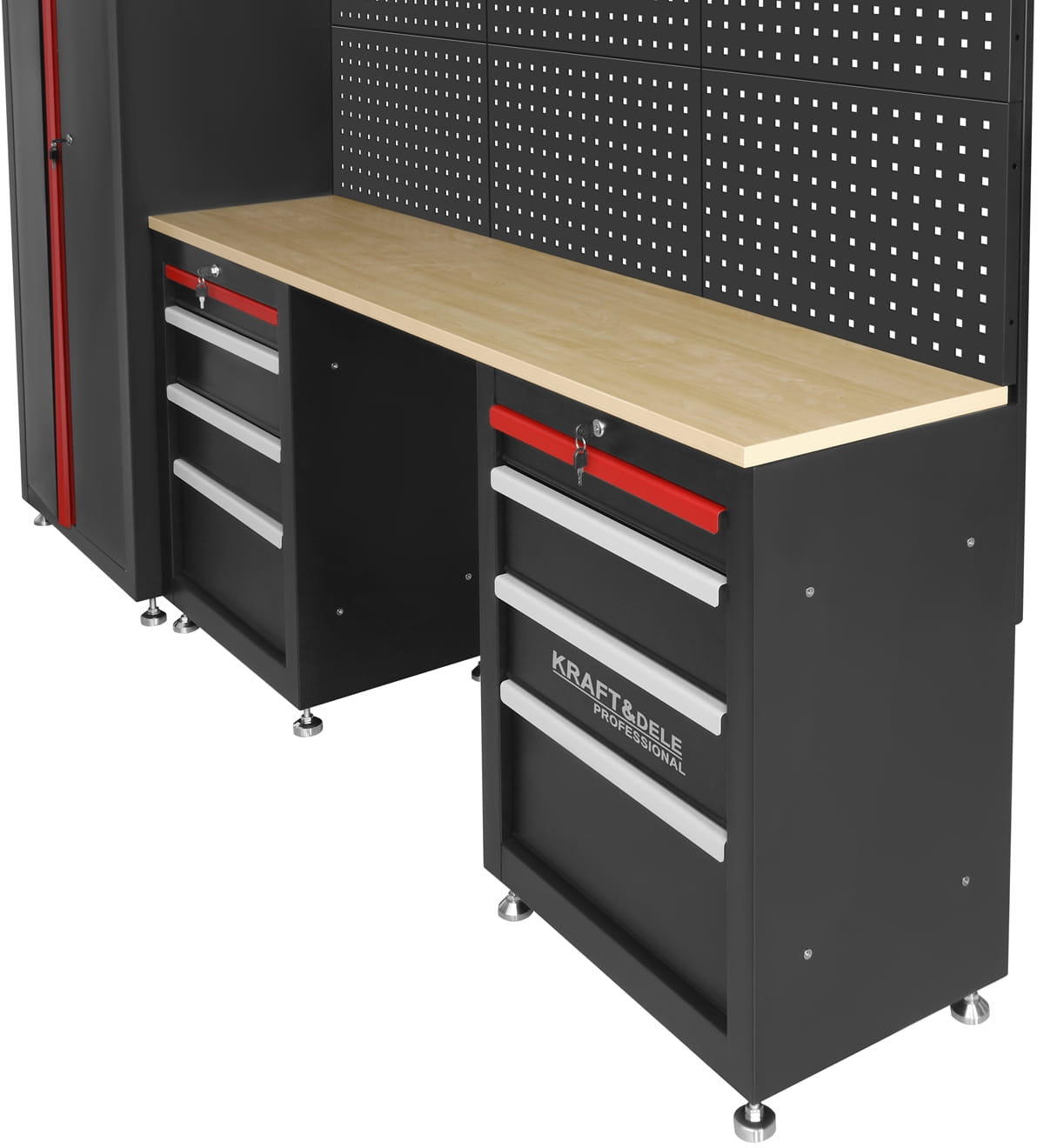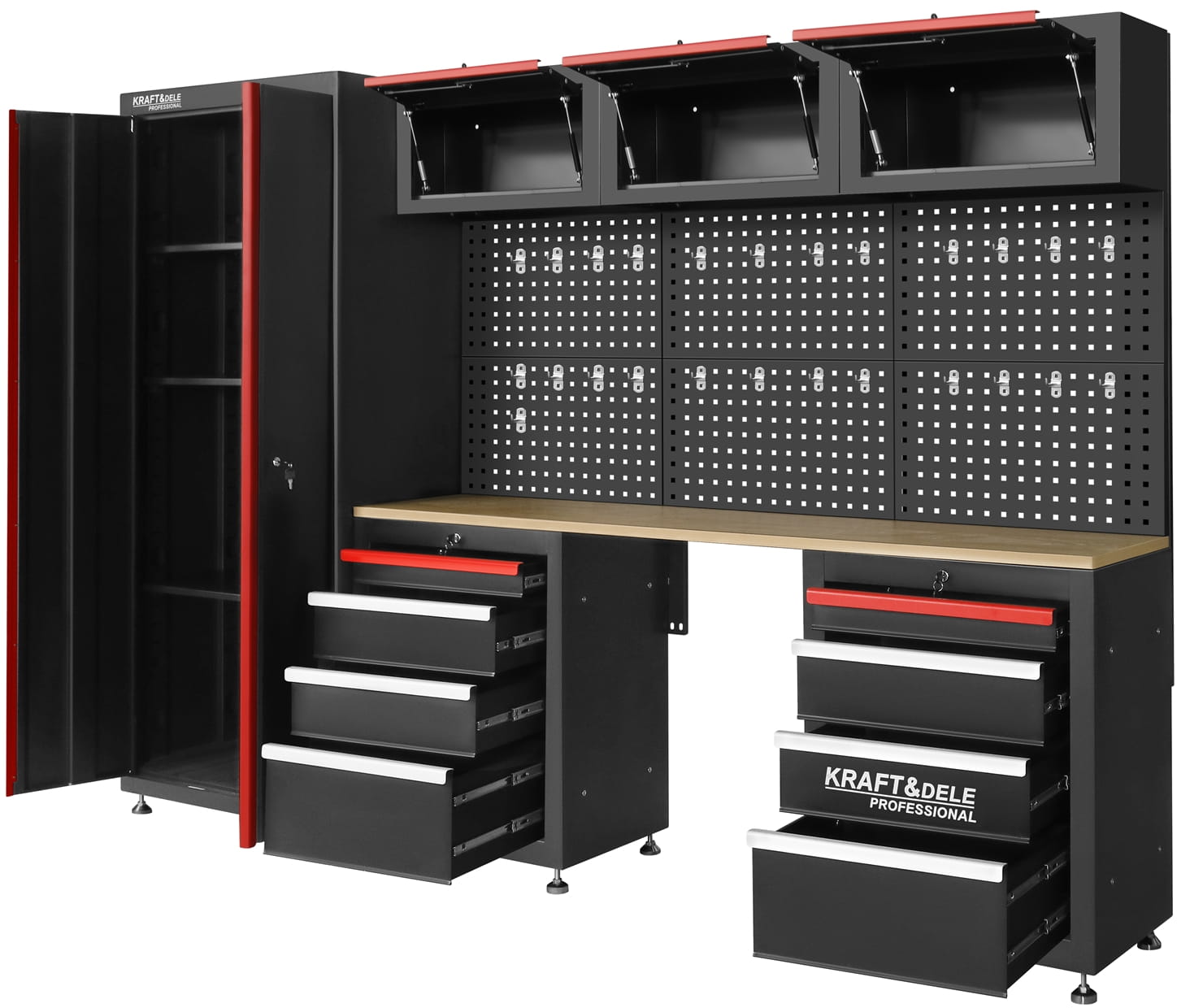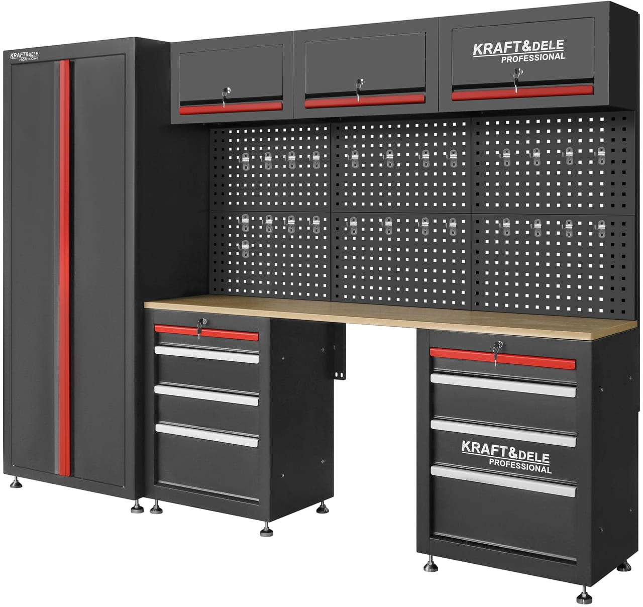 KD5861 to rozbudowany zestaw mebli warsztatowych marki KRAFT&DELE, zaprojektowany z myślą o wygodnej organizacji przestrzeni roboczej w warsztacie, garażu czy pracowni technicznej. Kompletny układ szafek, półek oraz perforowanych paneli pozwala uporządkować narzędzia, akcesoria i materiały w sposób przejrzysty i łatwo dostępny.
