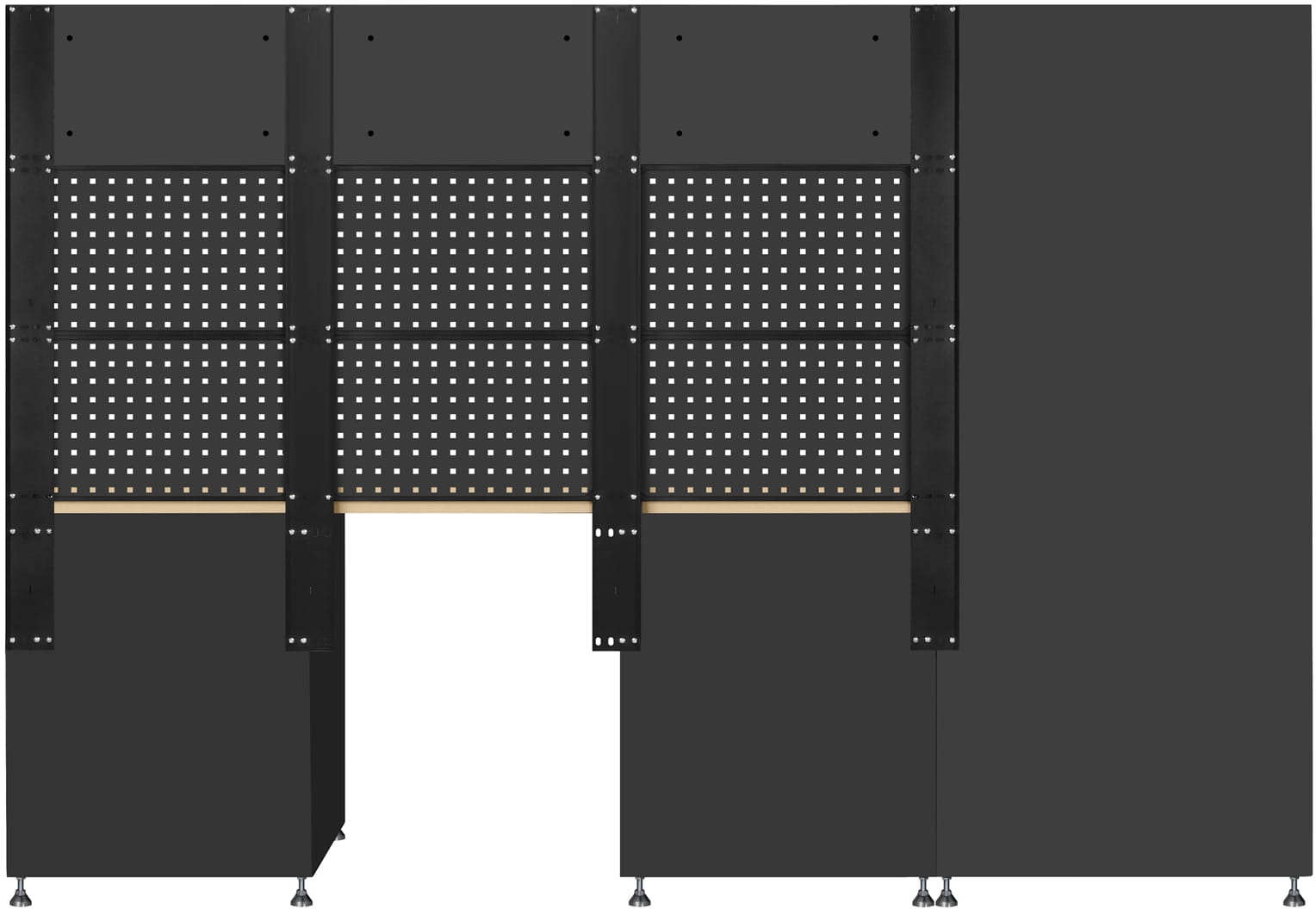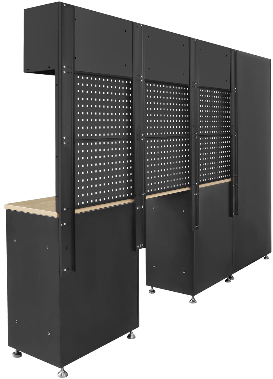 Zestaw oferuje dużą przestrzeń do przechowywania dzięki pojemnym szafkom stojącym, wiszącym oraz regulowanym półkom. Dwie szafki z szufladami ułatwiają segregację drobnych narzędzi, a perforowane tablice z haczykami umożliwiają wygodne zawieszenie narzędzi ręcznych. Solidny, drewniany blat roboczy jest przystosowany do intensywnej pracy i montażu imadła, co czyni zestaw funkcjonalnym centrum pracy. Regulowane nóżki pozwalają na stabilne ustawienie mebli nawet na nierównej powierzchni, a zamki w każdej szafce zwiększają bezpieczeństwo przechowywanego wyposażenia.
